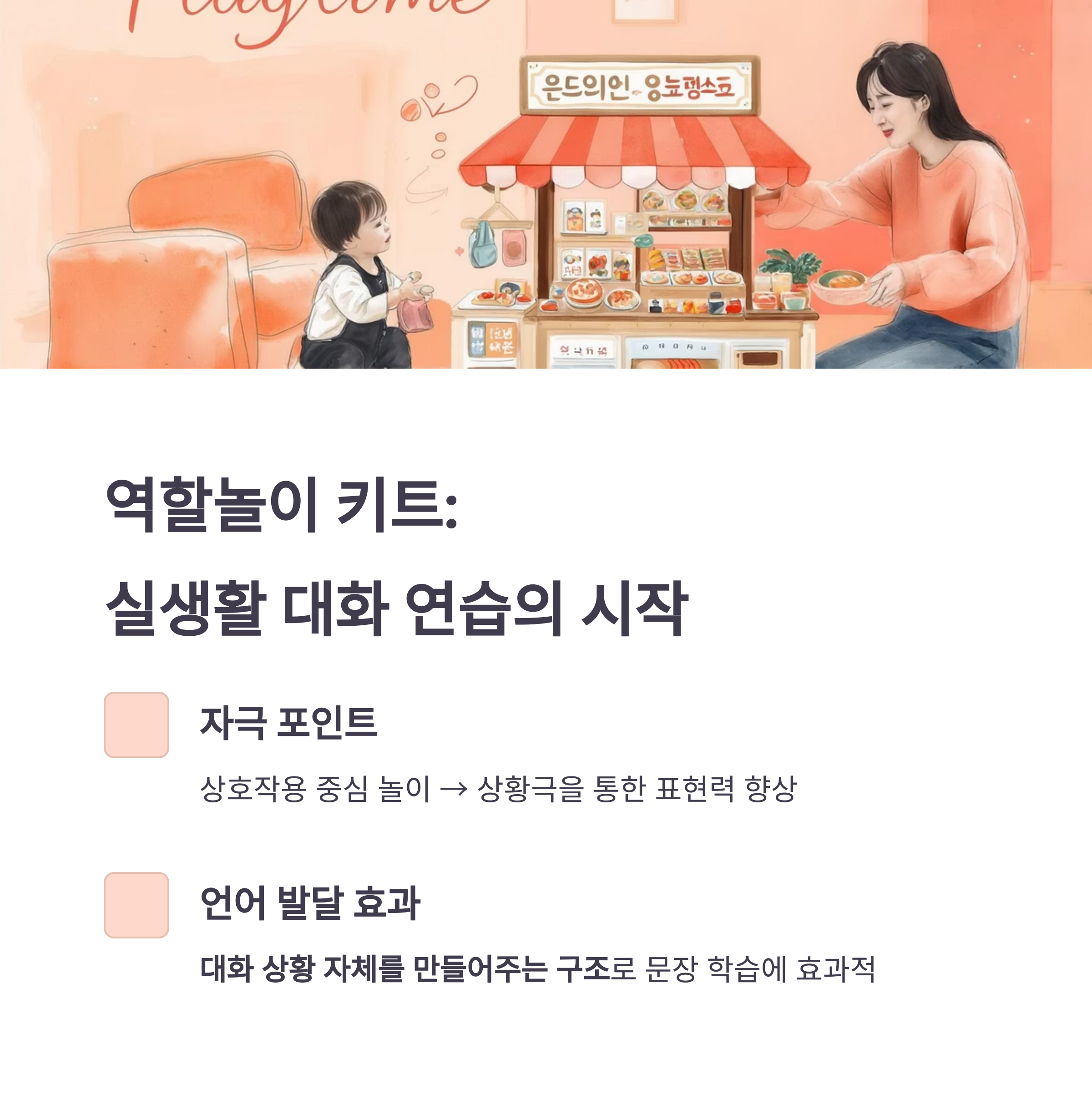 - 자극 포인트: 상호작용 중심 놀이 → 상황극을 통한 표현력 향상