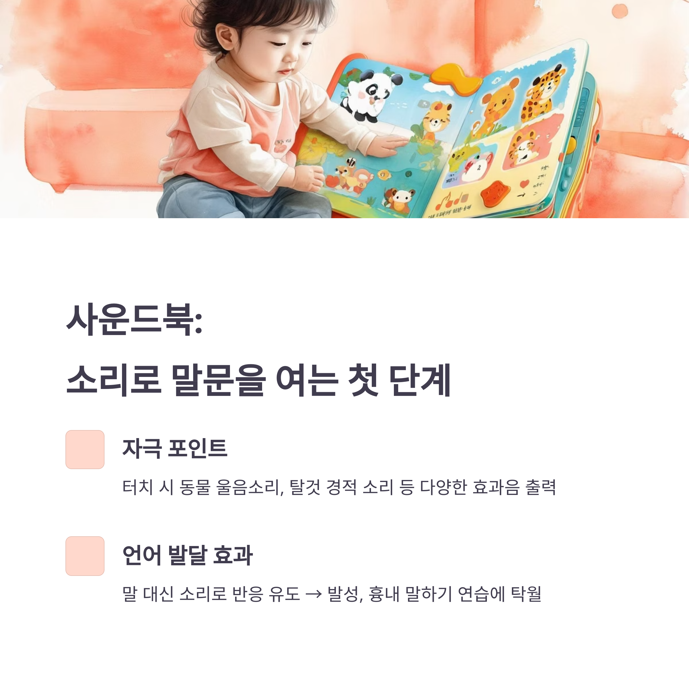 - 언어 발달 효과: 말 대신 소리로 반응 유도 → 발성, 흉내 말하기 연습에 탁월