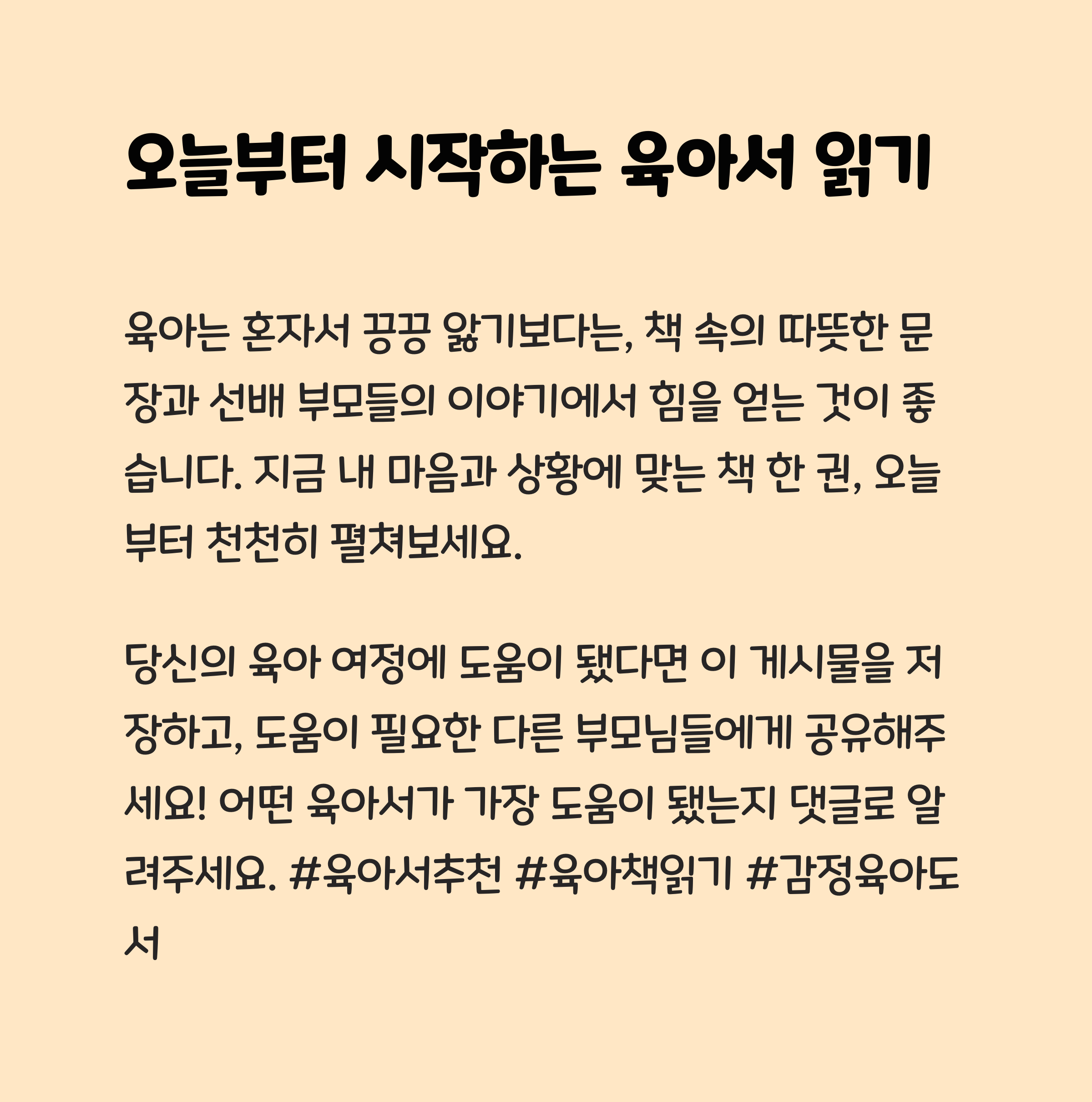 육아는 혼자서 끙끙 앓기보다는, 책 속의 따뜻한 문장과 선배 부모들의 이야기에서 힘을 얻는 것이 좋아요. 꼭 정독하지 않아도 괜찮아요. 나에게 필요한 한 문장, 한 페이지만으로도 큰 위로가 될 수 있으니까요. 지금 내 마음과 상황에 맞는 책 한 권, 오늘부터 천천히 펼쳐보세요.