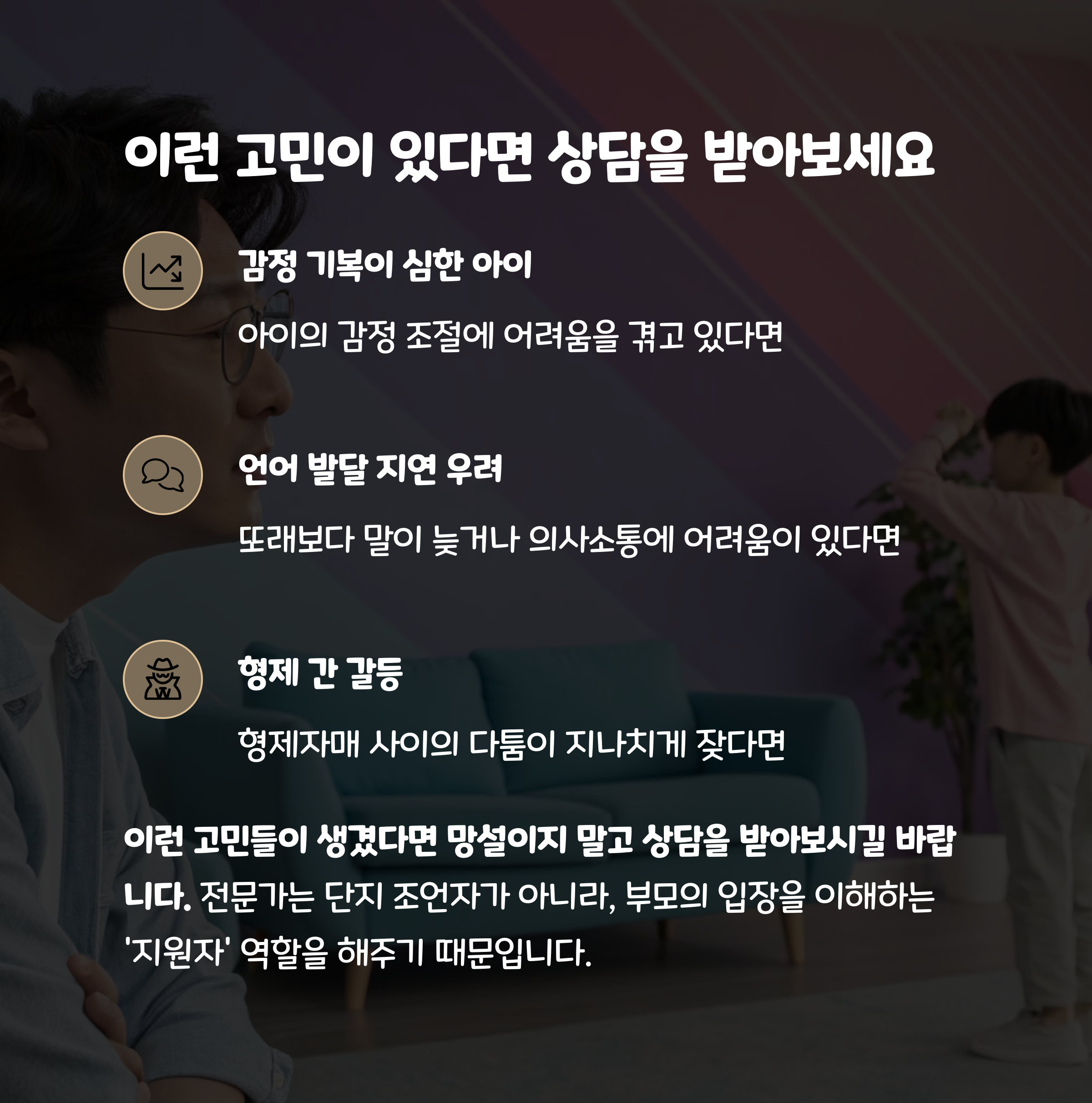 전문가는 단지 조언자가 아니라, 부모의 입장을 이해하는 ‘지원자’ 역할을 해주기 때문입니다.