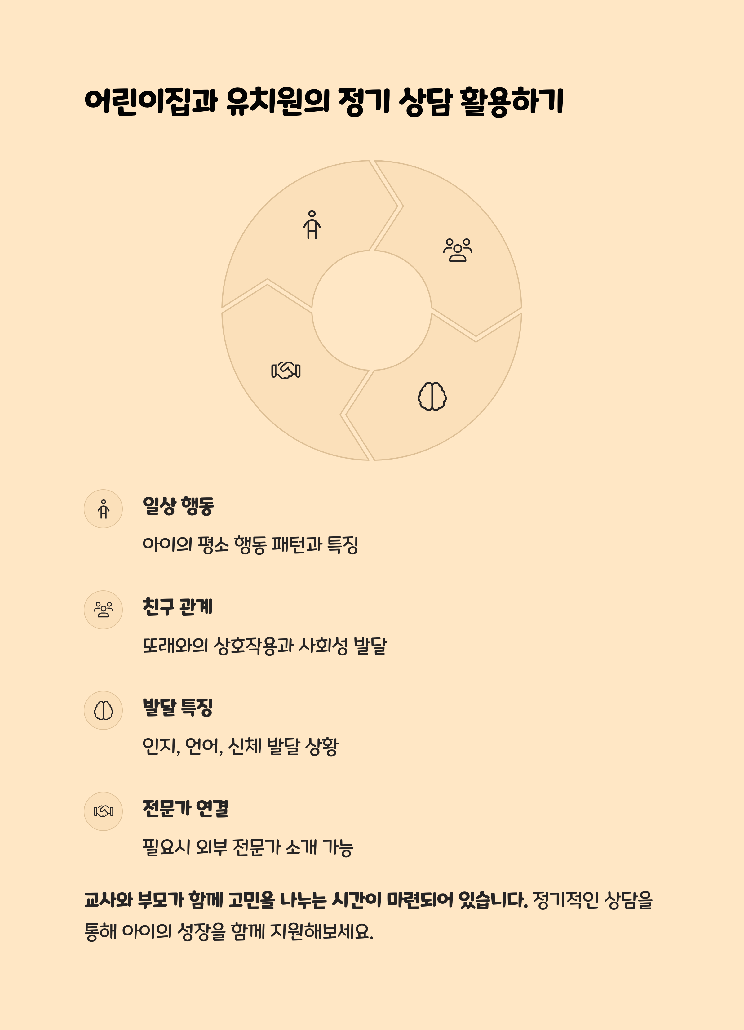 대부분의 어린이집과 유치원에서는 학부모 대상의 정기 상담을 운영합니다.
