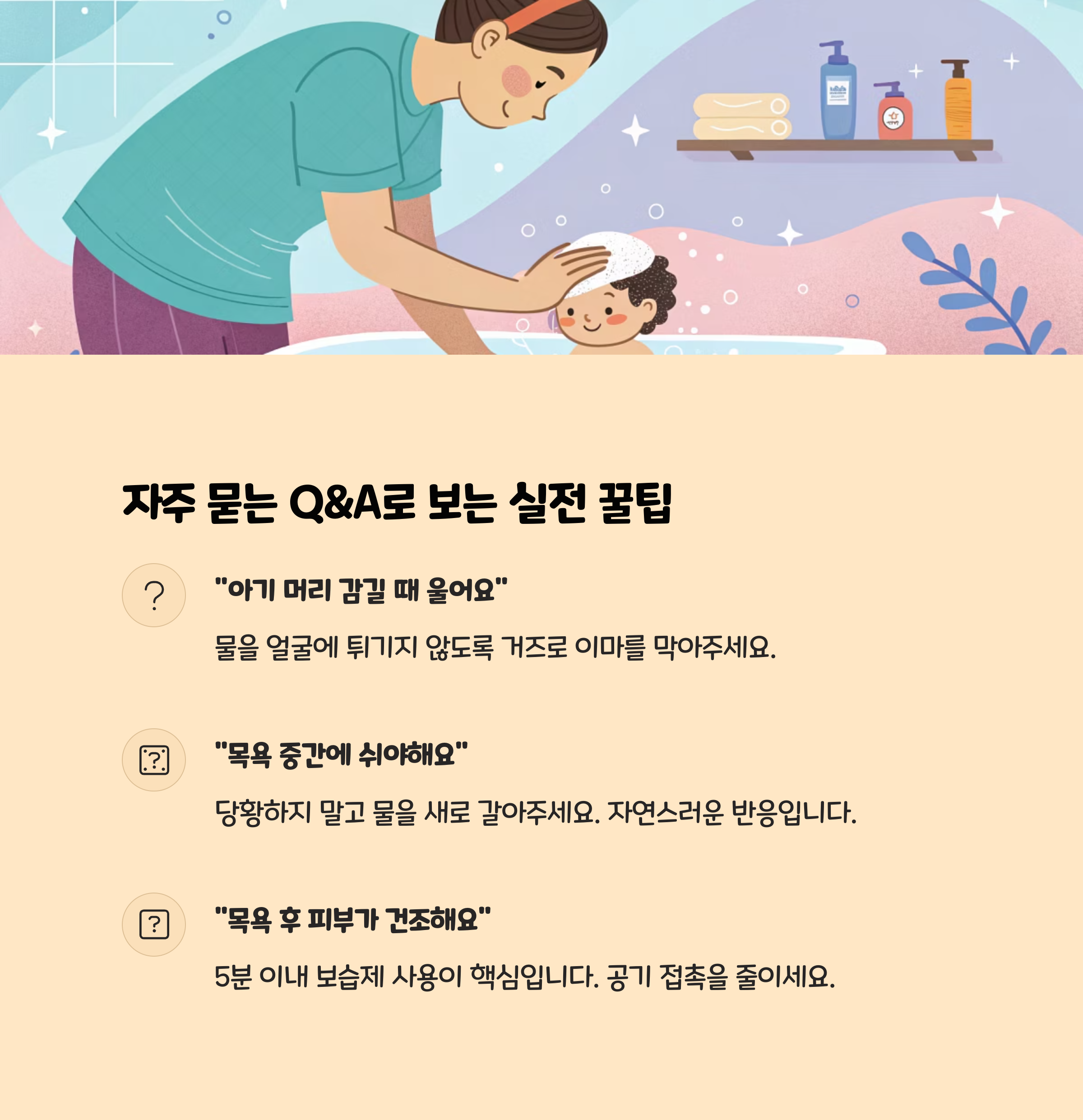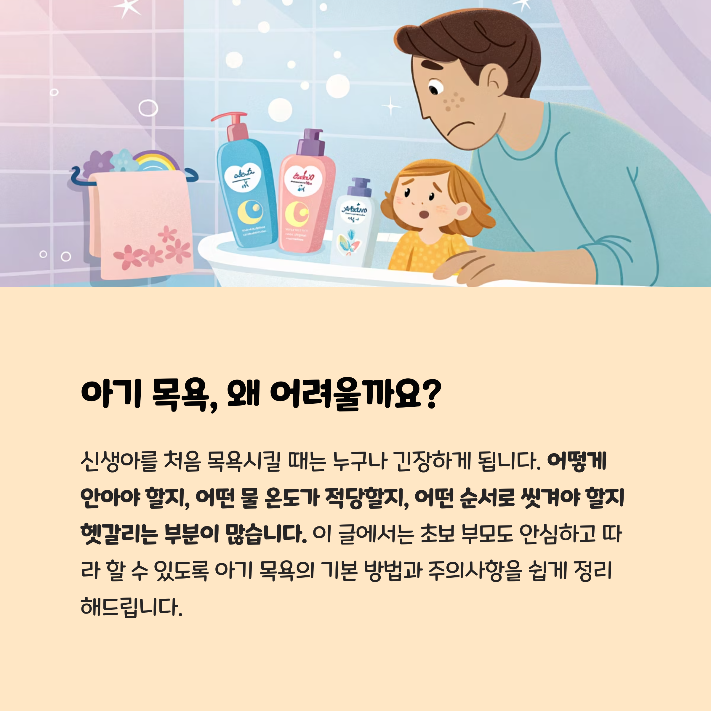 어떻게 안아야 할지, 어떤 물 온도가 적당할지, 어떤 순서로 씻겨야 할지 헷갈리는 부분이 많습니다.