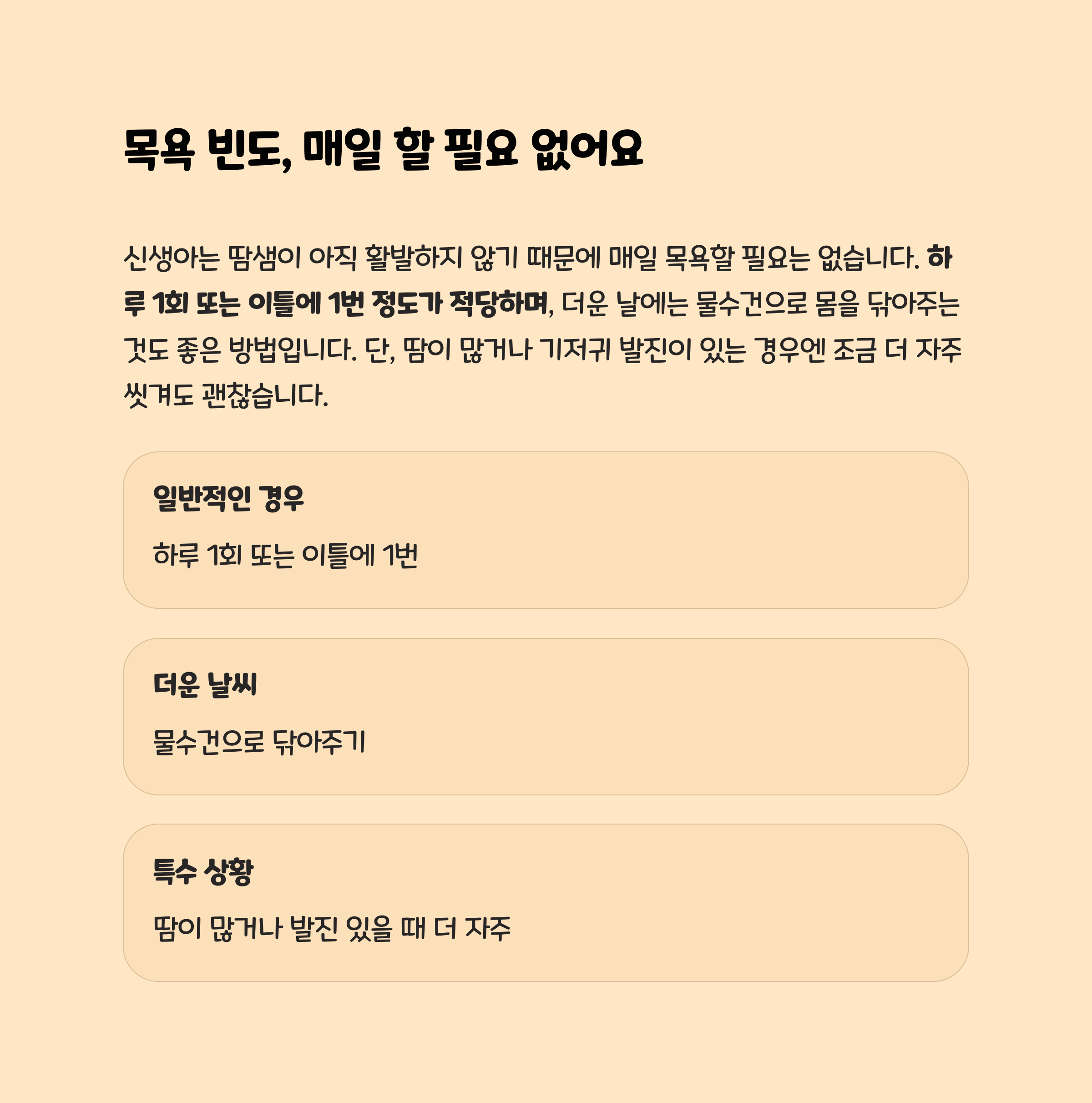 단, 땀이 많거나 기저귀 발진이 있는 경우엔 조금 더 자주 씻겨도 괜찮습니다.