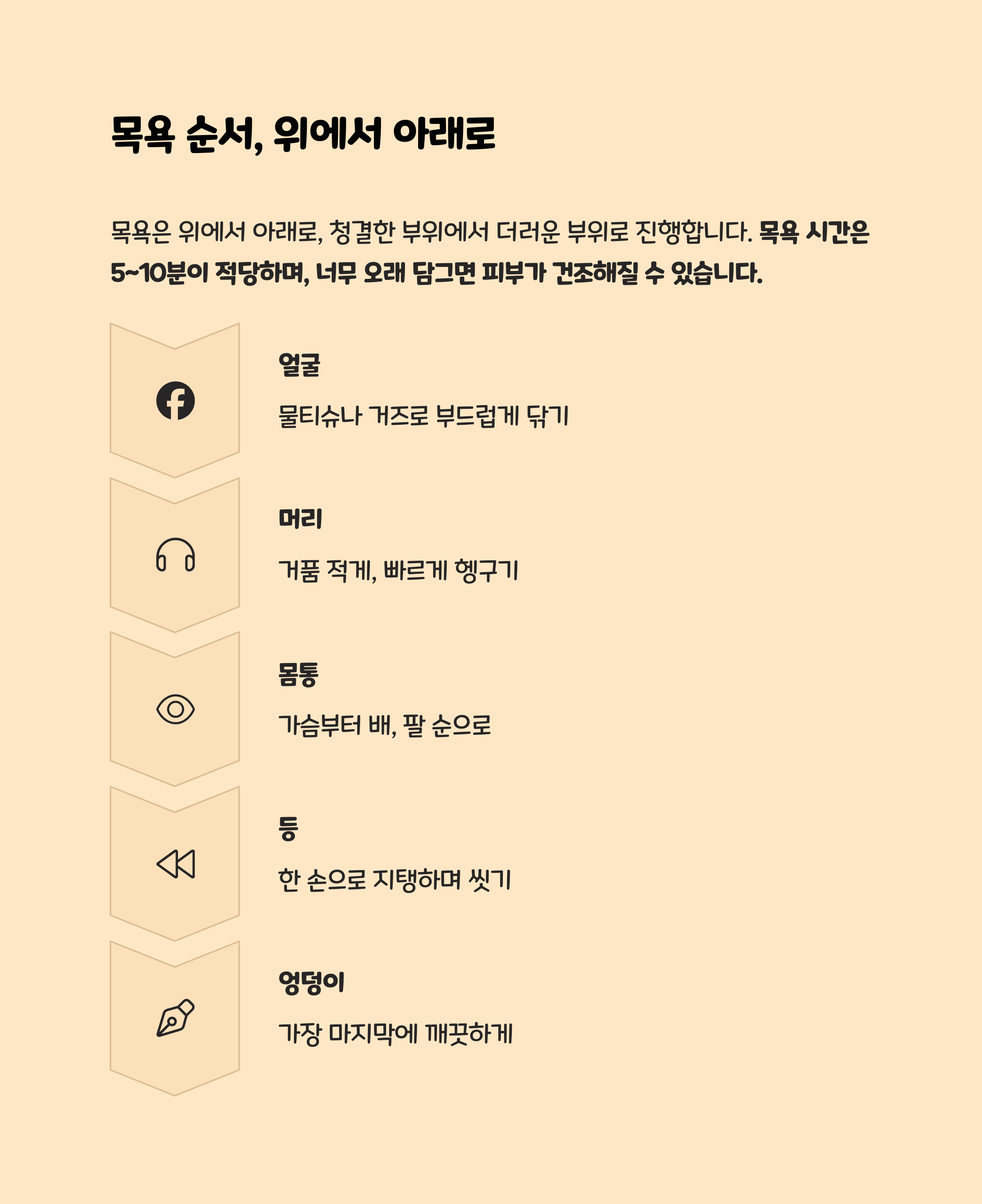 목욕은 위에서 아래로, 청결한 부위에서 더러운 부위로 진행합니다.