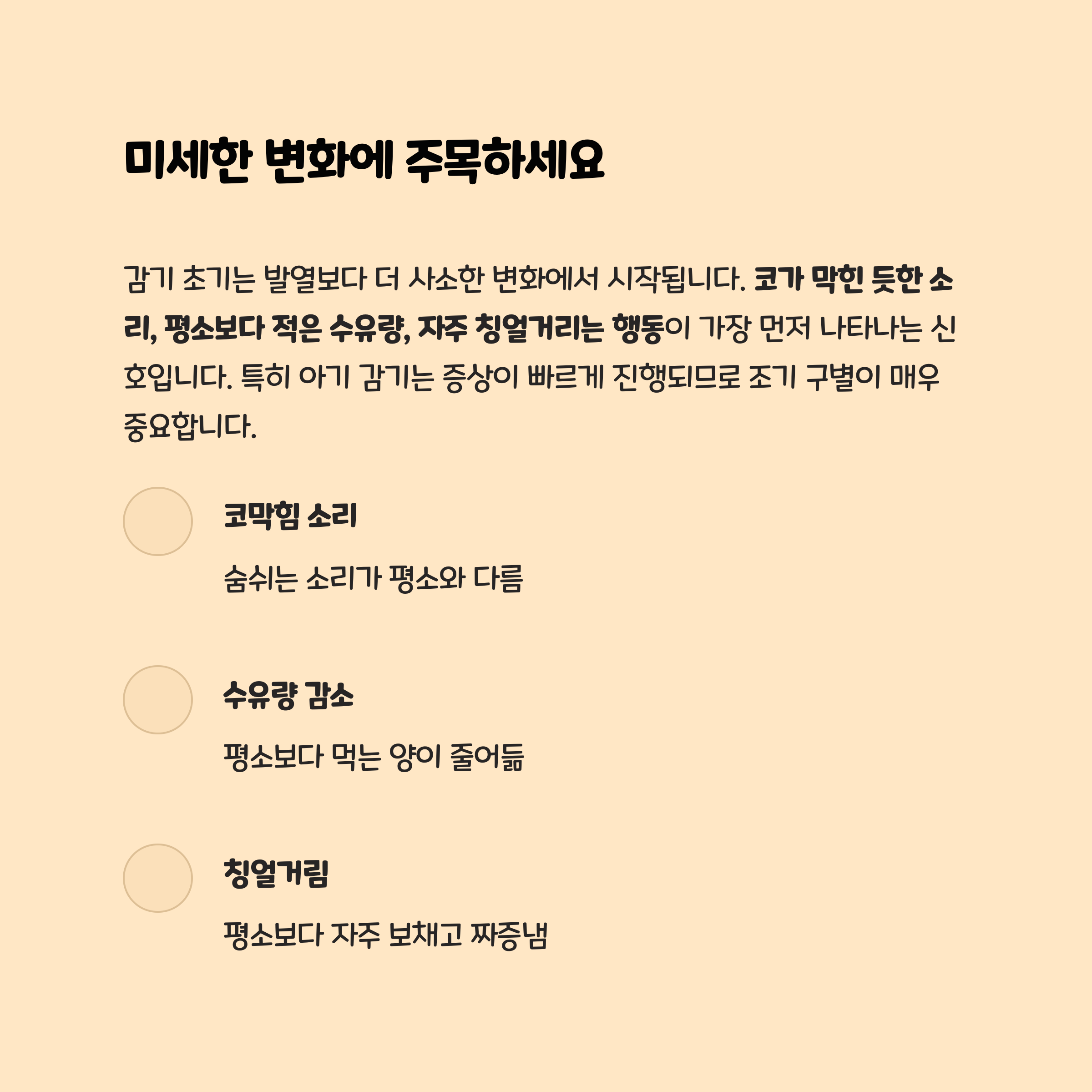 코가 막힌 듯한 소리, 평소보다 적은 수유량, 자주 칭얼거리는 행동