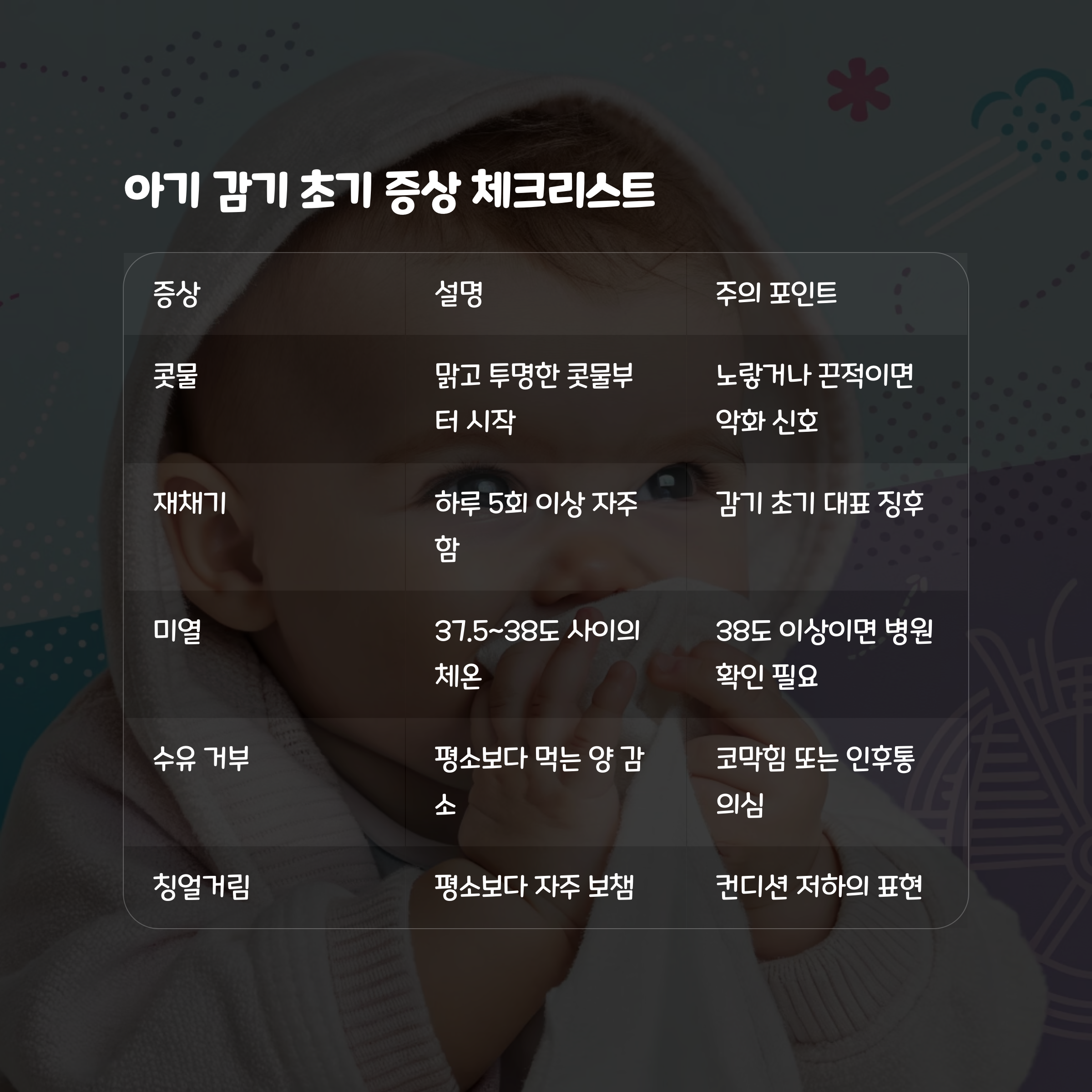 아기는 말을 하지 못하기 때문에 감기 초기 증상을 놓치기 쉽습니다.