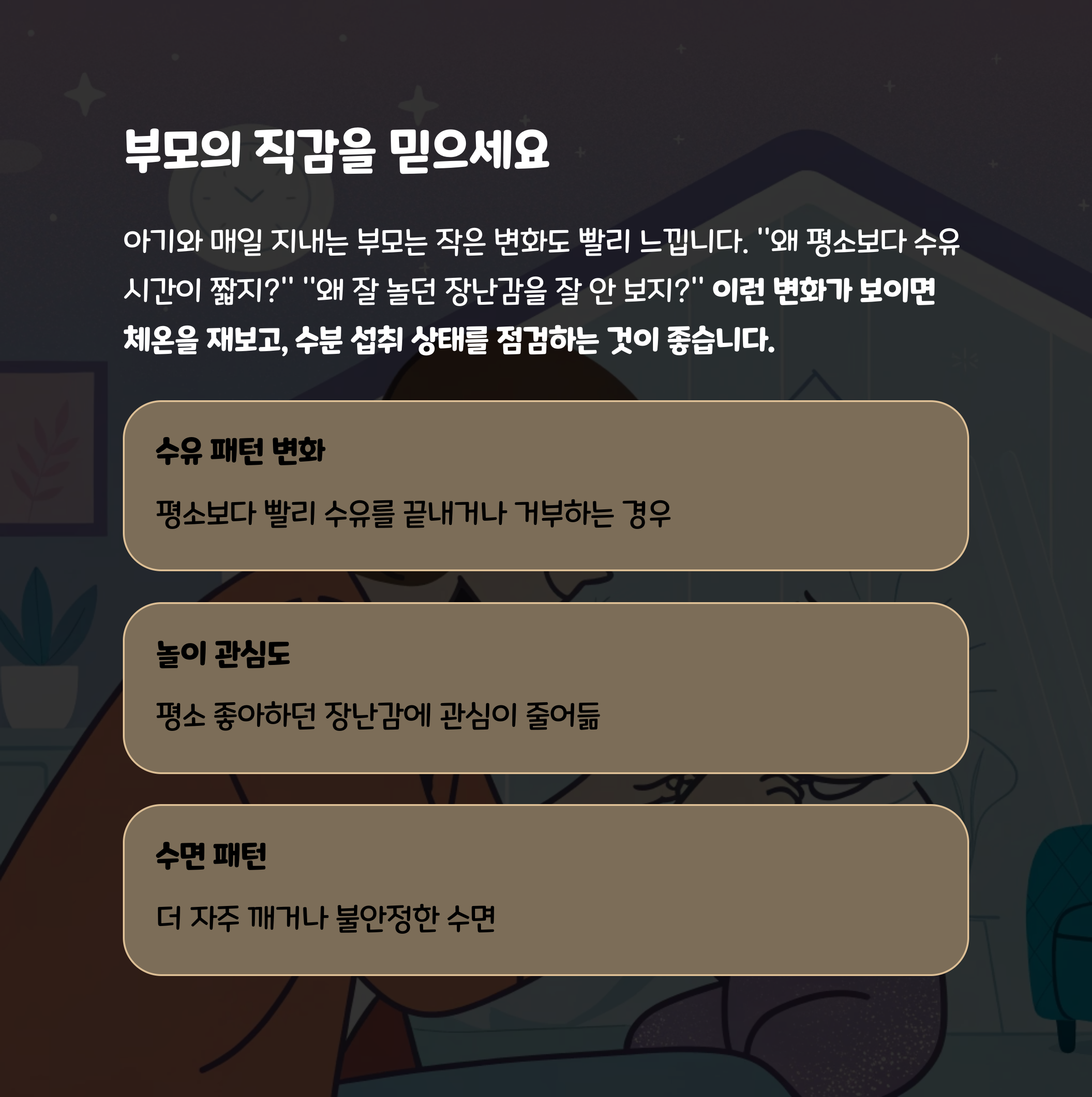 이런 변화가 보이면 체온을 재보고, 수분 섭취 상태를 점검하는 것이 좋습니다.