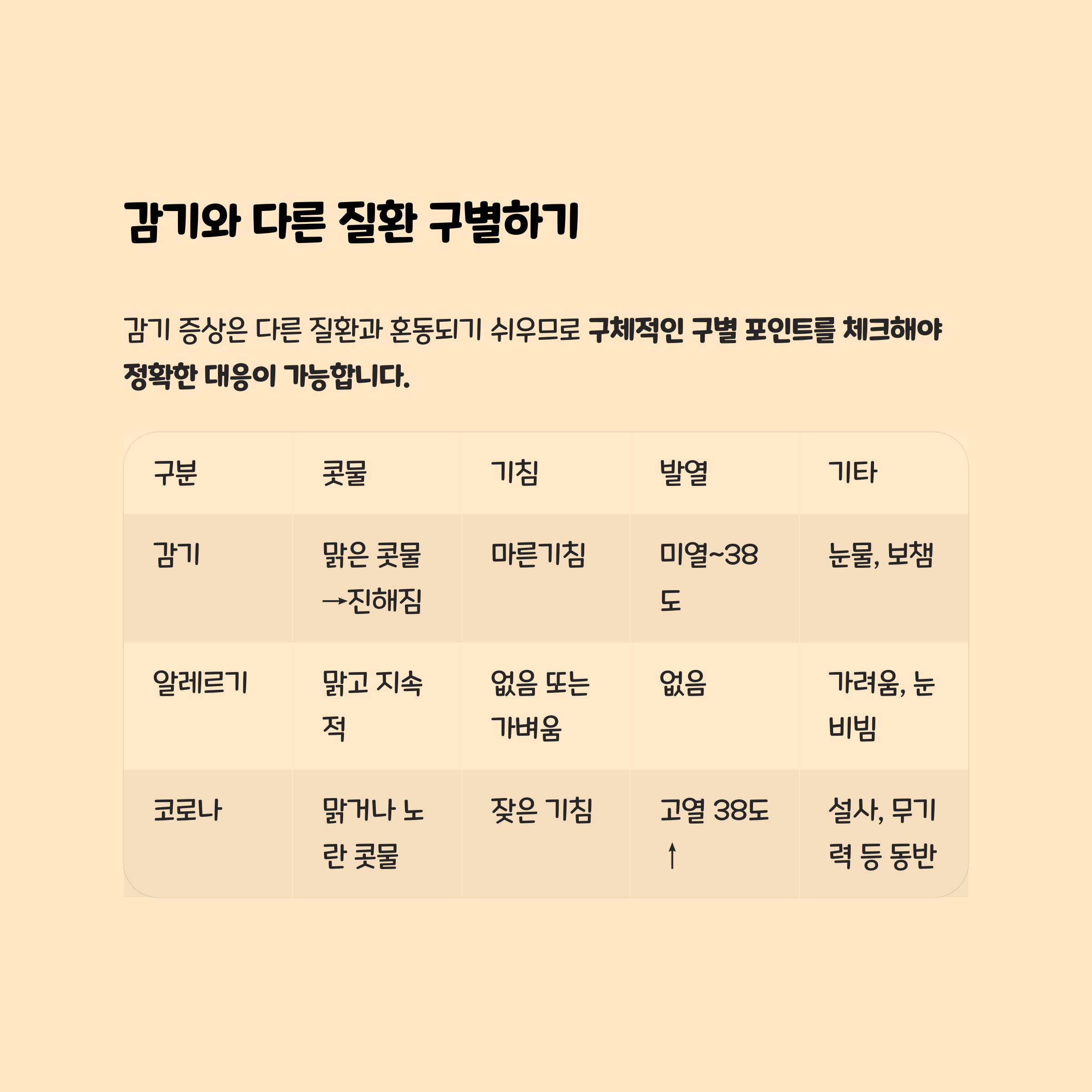 콧물 맑고 투명한 콧물부터 시작 노랗거나 끈적이면 악화 신호