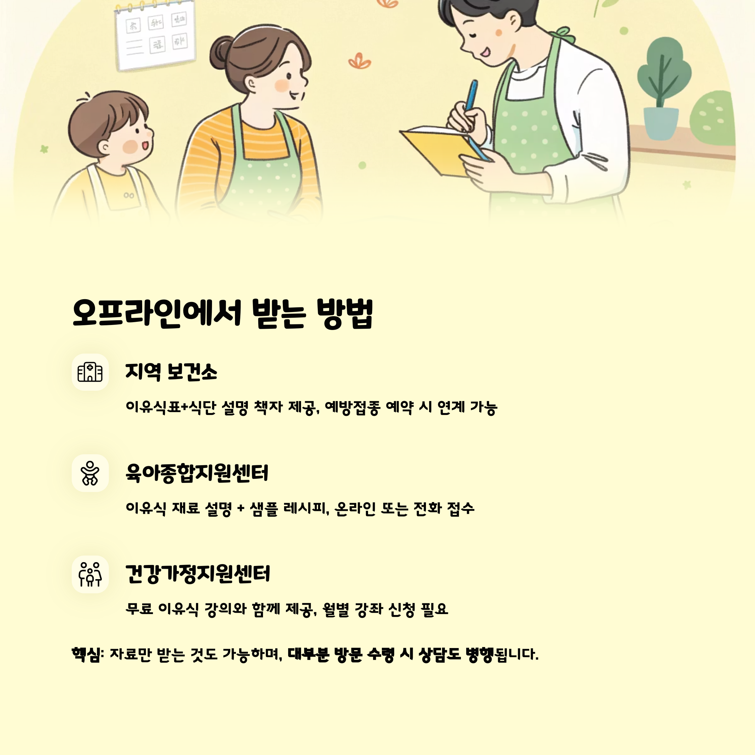 | 지역 보건소 | 이유식표+식단 설명 책자 제공 | 예방접종 예약 시 연계 |