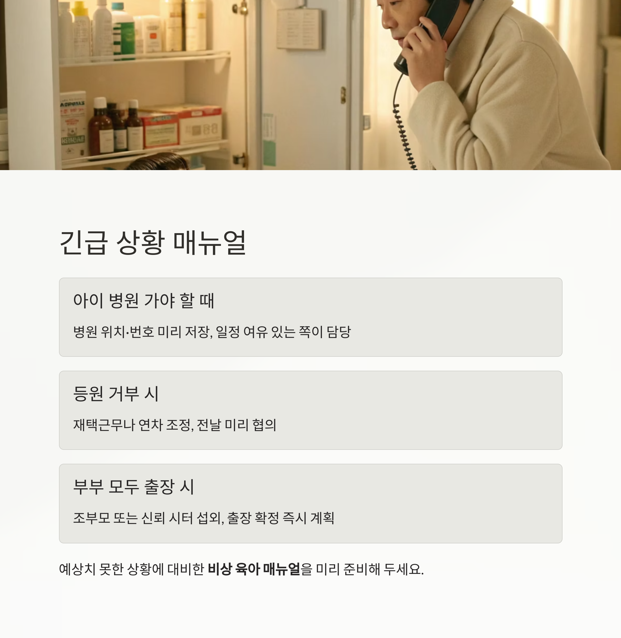 | 아이 병원 가야 할 때 | 병원 위치·번호 미리 저장 | 일정 여유 있는 쪽 |