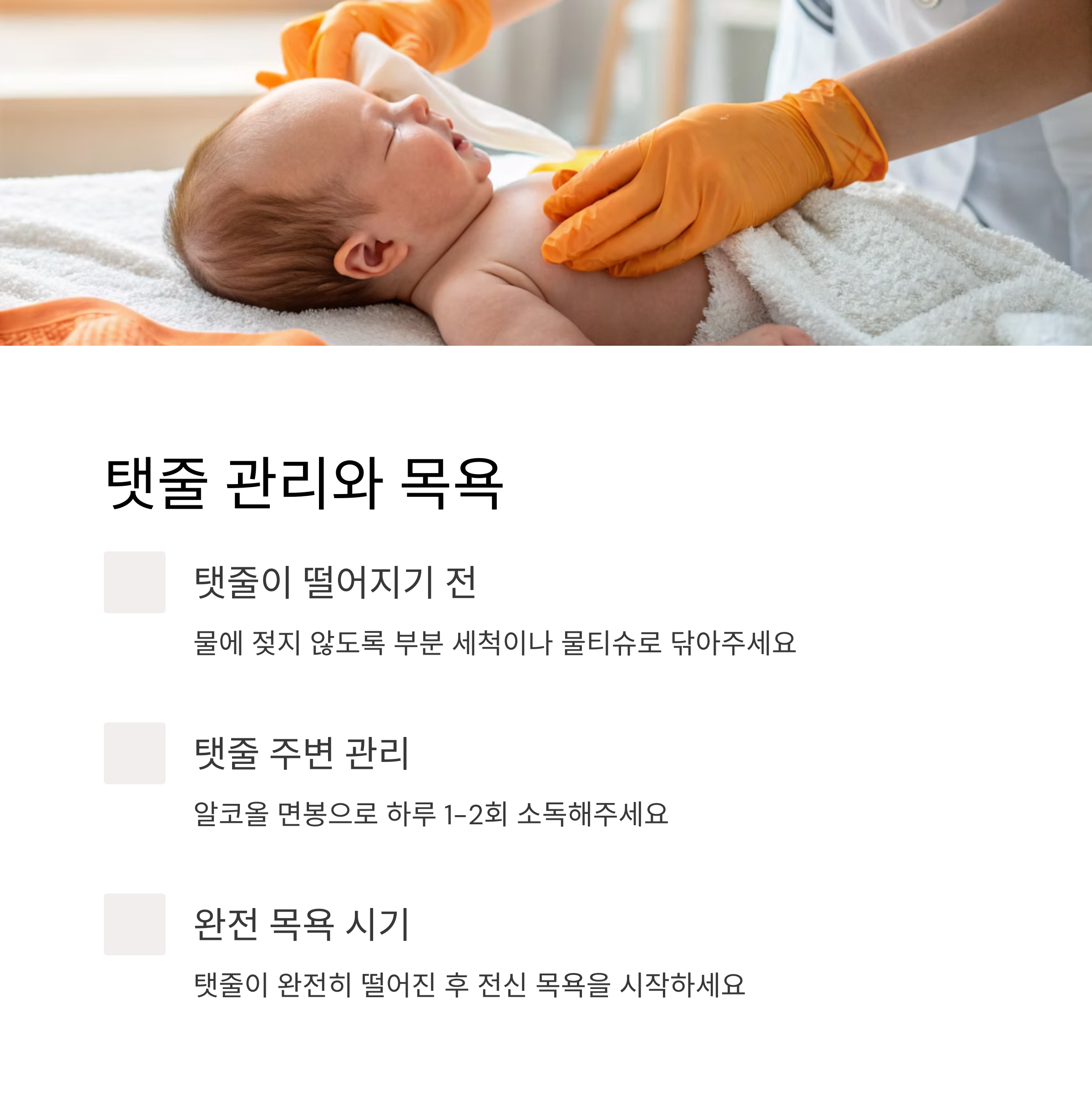 마르지 않은 탯줄은 물에 젖지 않도록 해야 하며, 부분 세척이나 물티슈로 닦는 게 좋아요.