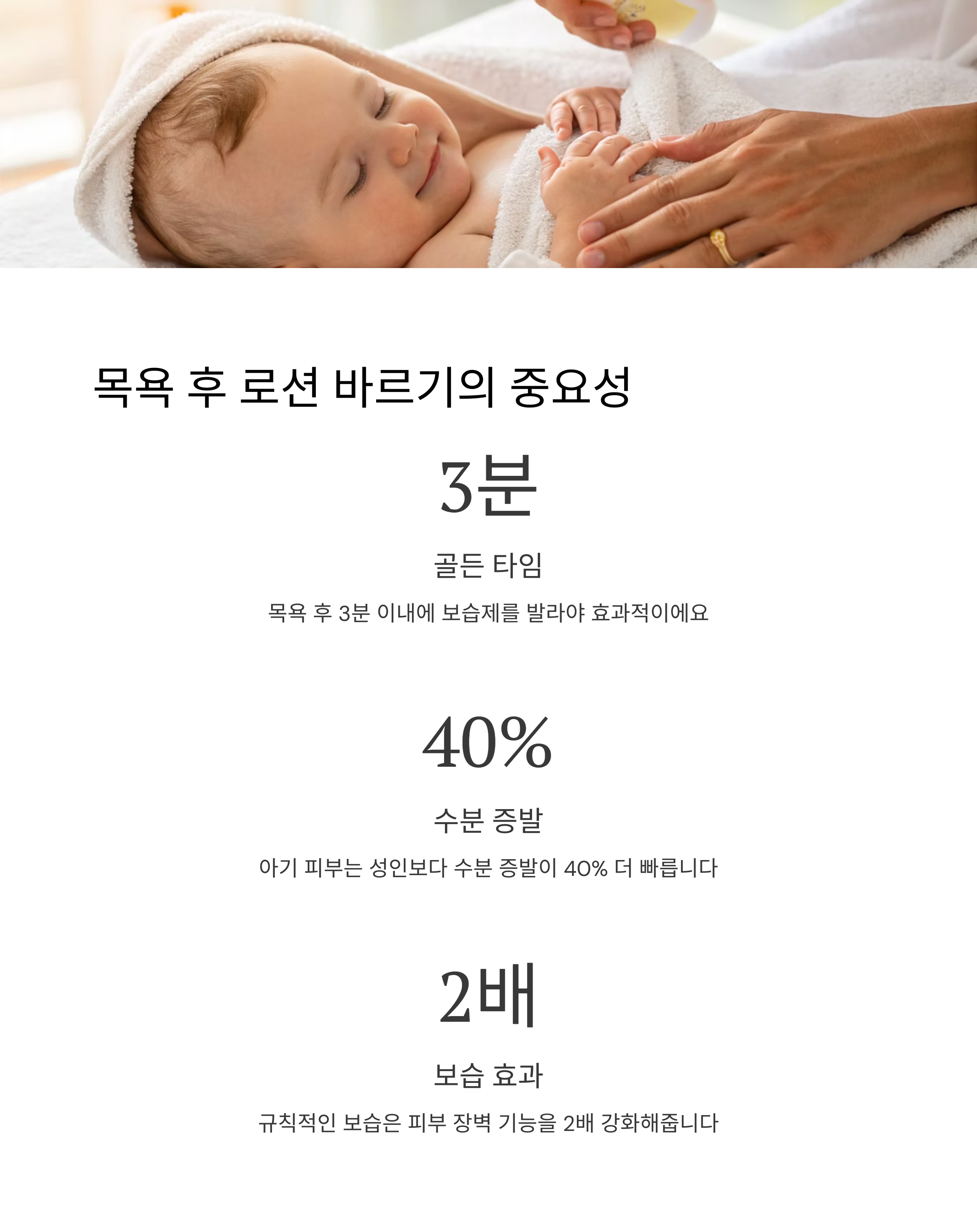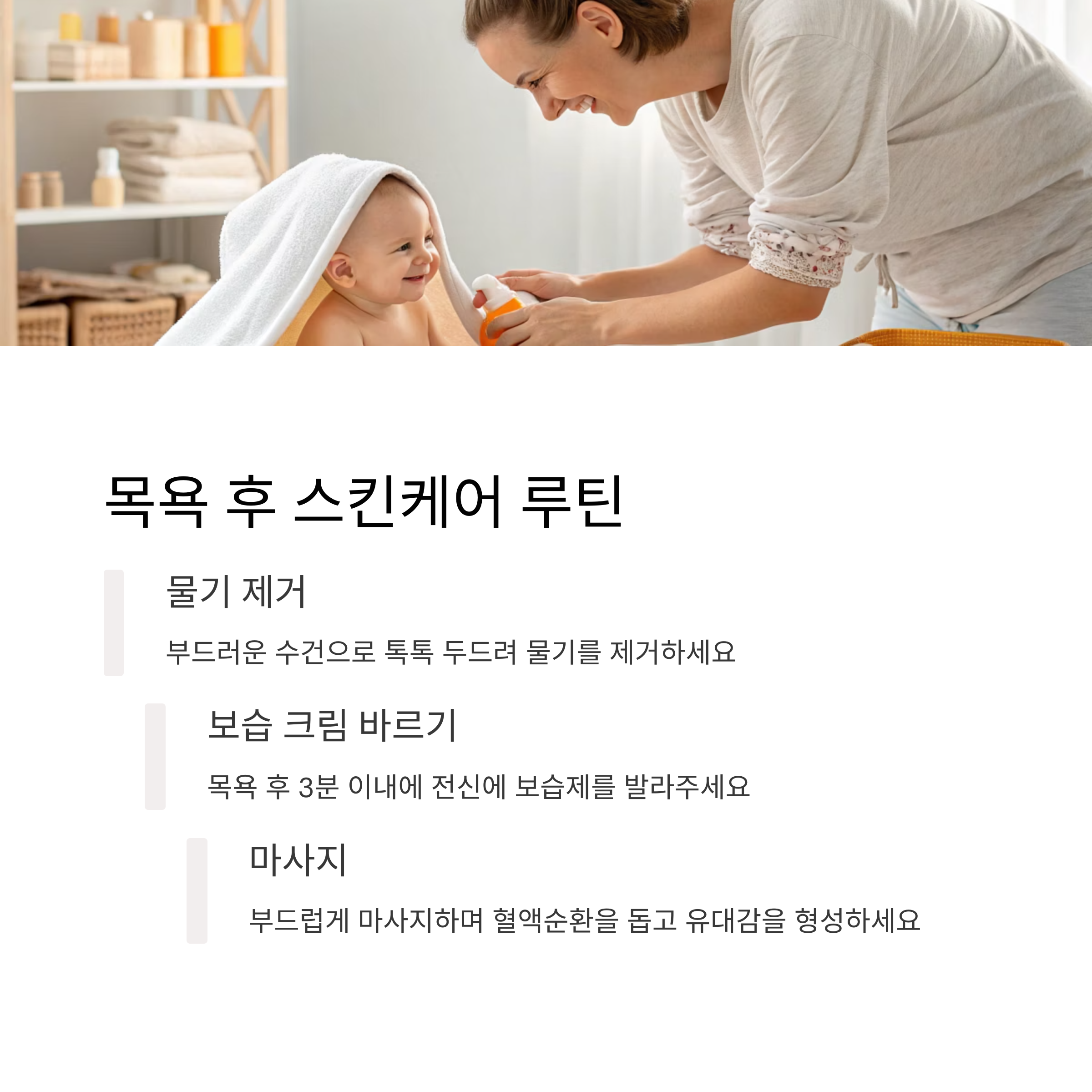 아기 피부는 수분 증발이 빠르기 때문에 목욕 직후 로션이나 크림으로 보습을 해주는 게 중요해요.