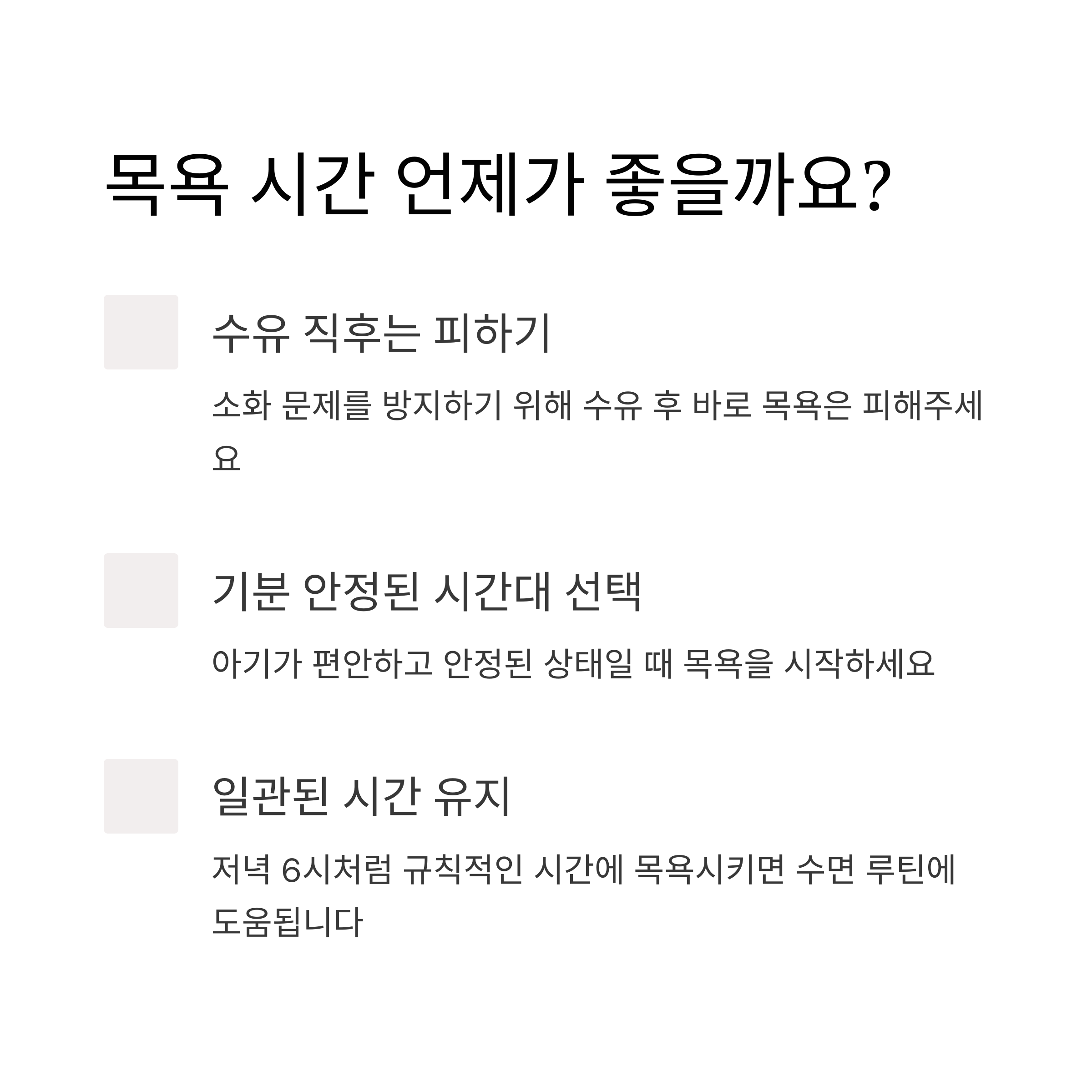 처음엔 순서가 헷갈리기 쉬워요. 아래 리스트를 참고해서 루틴을 만들어보세요. 일관성 있는 루틴은 아기에게도 안정감을 줍니다.
