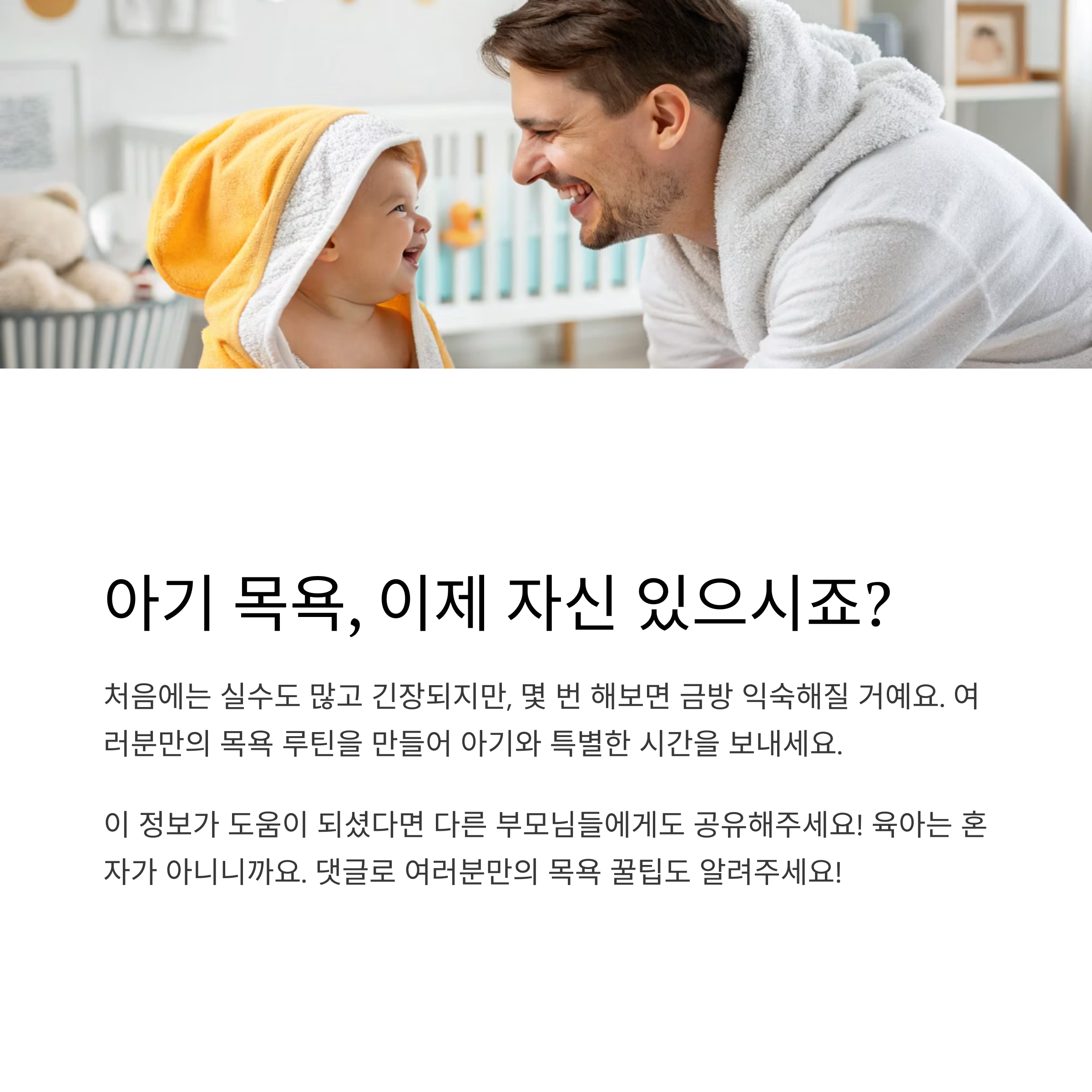 오늘은 아기 목욕에 대해 기본부터 실전 노하우까지 자세히 정리해봤어요. 처음에는 실수도 많고 긴장도 되겠지만, 몇 번 해보면 정말 금방 익숙해질 거예요. 여러분도 자신만의 루틴을 만들고, 목욕이 아기에게도 엄마 아빠에게도 즐거운 시간이 되길 바랍니다. 혹시 궁금한 점이나 공유하고 싶은 노하우가 있다면 댓글로 함께 나눠요! 우리 육아는 혼자가 아니니까요.