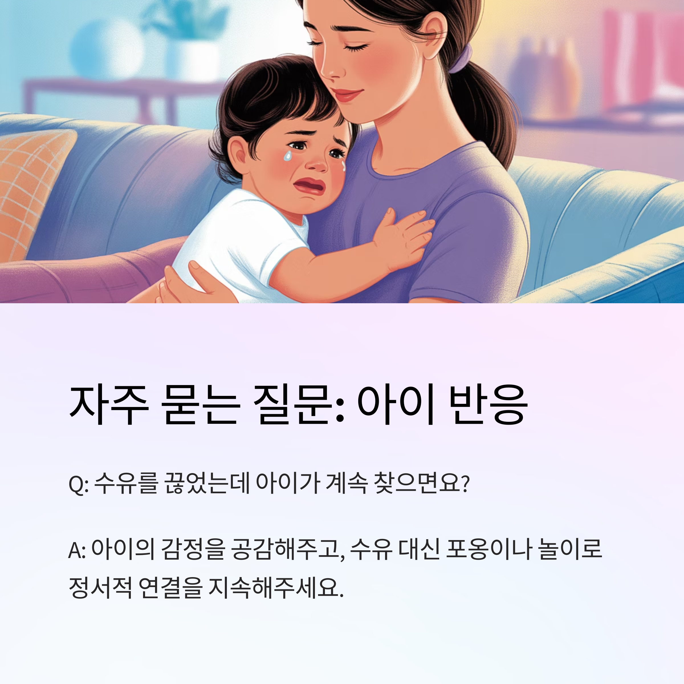 아이의 감정을 공감해주고, 수유 대신 포옹이나 놀이로 정서적 연결을 지속해주세요.