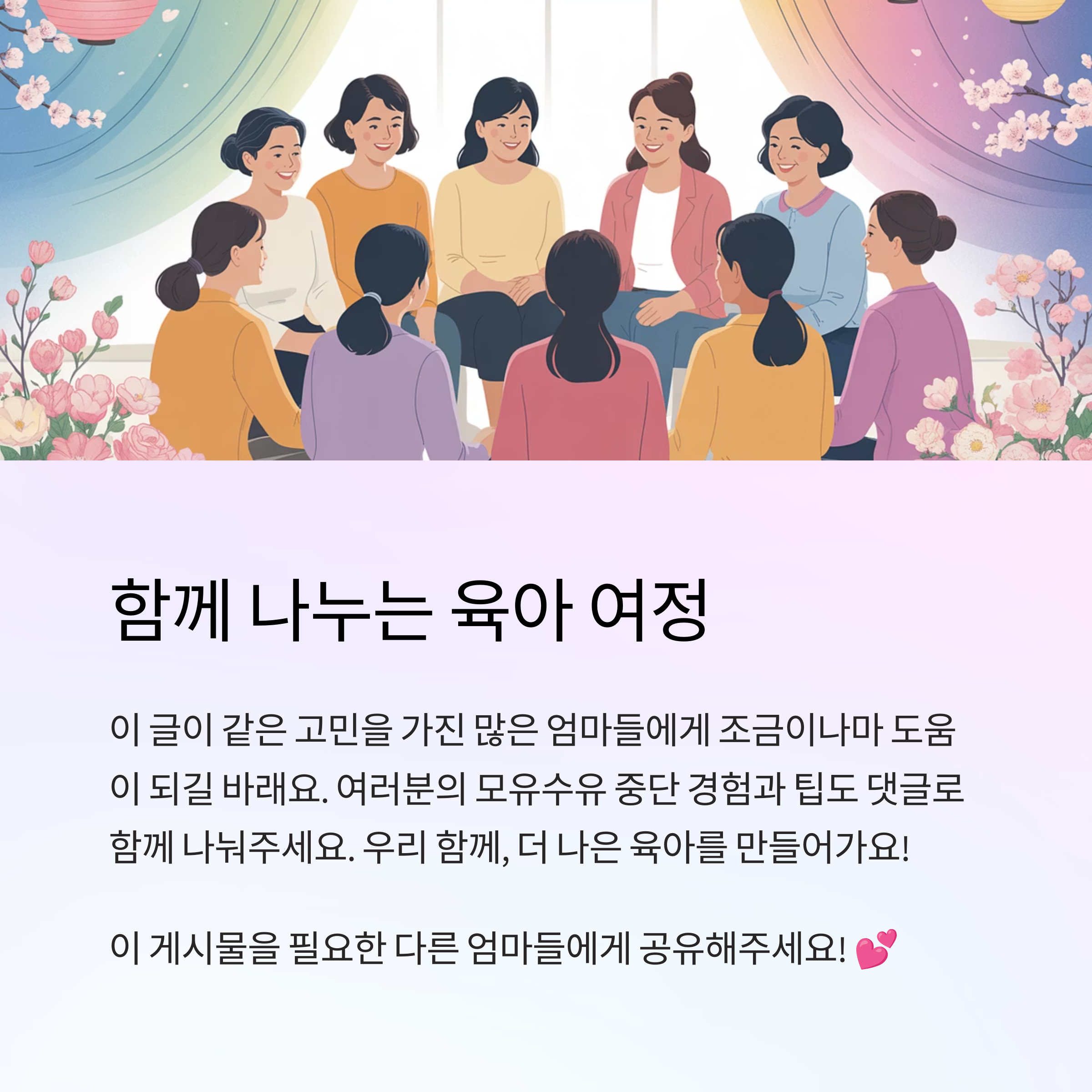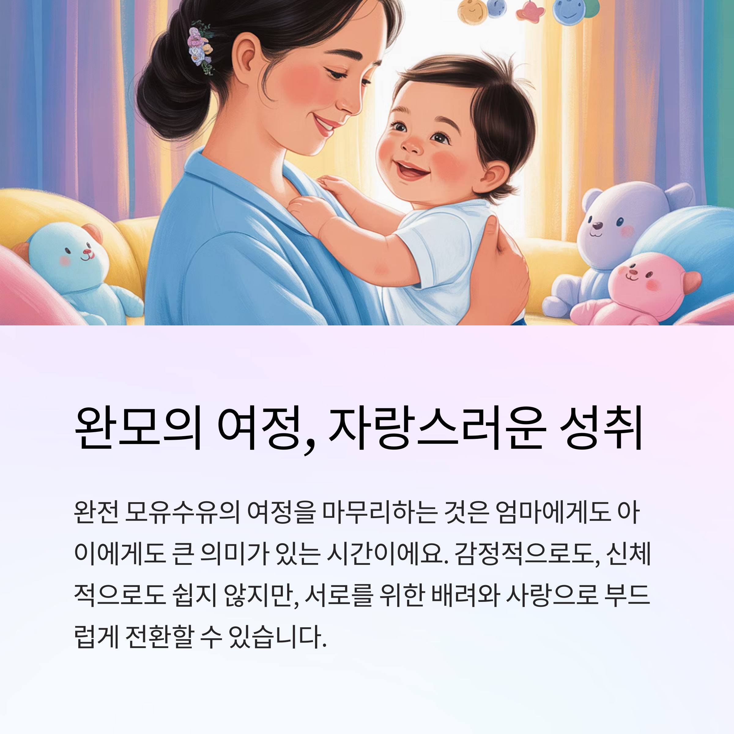 완모의 여정을 마무리하는 건 엄마에게도 아이에게도 큰 의미가 있는 시간이죠. 감정적으로도, 신체적으로도 쉽지 않지만, 서로를 위한 배려와 사랑으로 부드럽게 전환하는 것이 가장 중요하답니다. 이 글이 같은 고민을 가진 많은 엄마들에게 조금이나마 도움이 되길 바래요. 여러분의 이야기도 댓글로 함께 나눠주세요. 우리 함께, 더 나은 육아를 만들어가요 :)