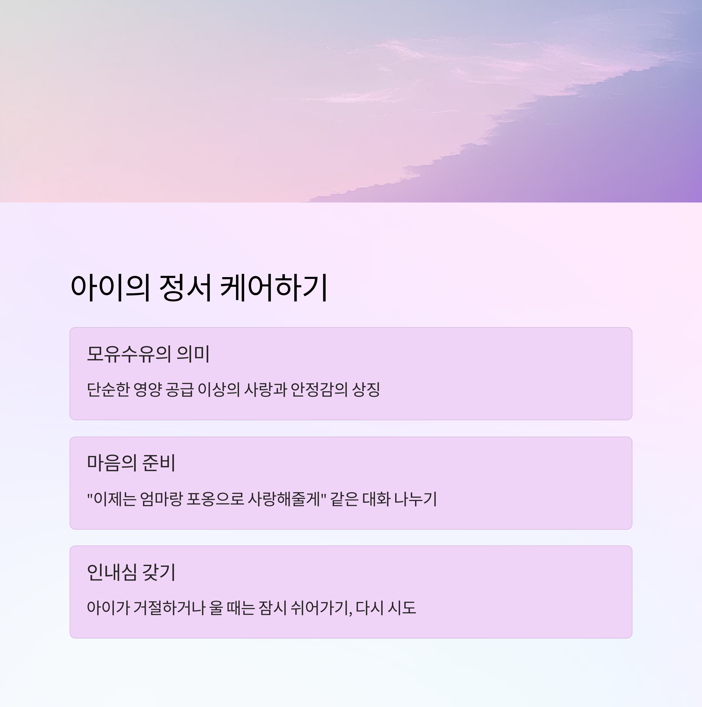 모유수유는 단순한 영양 공급 이상의 의미가 있죠. 아이에게는 사랑과 안정감의 상징이기도 해요. 갑작스러운 수유 중단은 아이에게 혼란을 줄 수 있기 때문에, '마음의 준비'를 함께 해줘야 해요. 특히 아이가 수유를 찾을 때는 "이제는 엄마랑 포옹으로 사랑해줄게" 같은 대화를 자주 나눠주는 것이 좋아요.