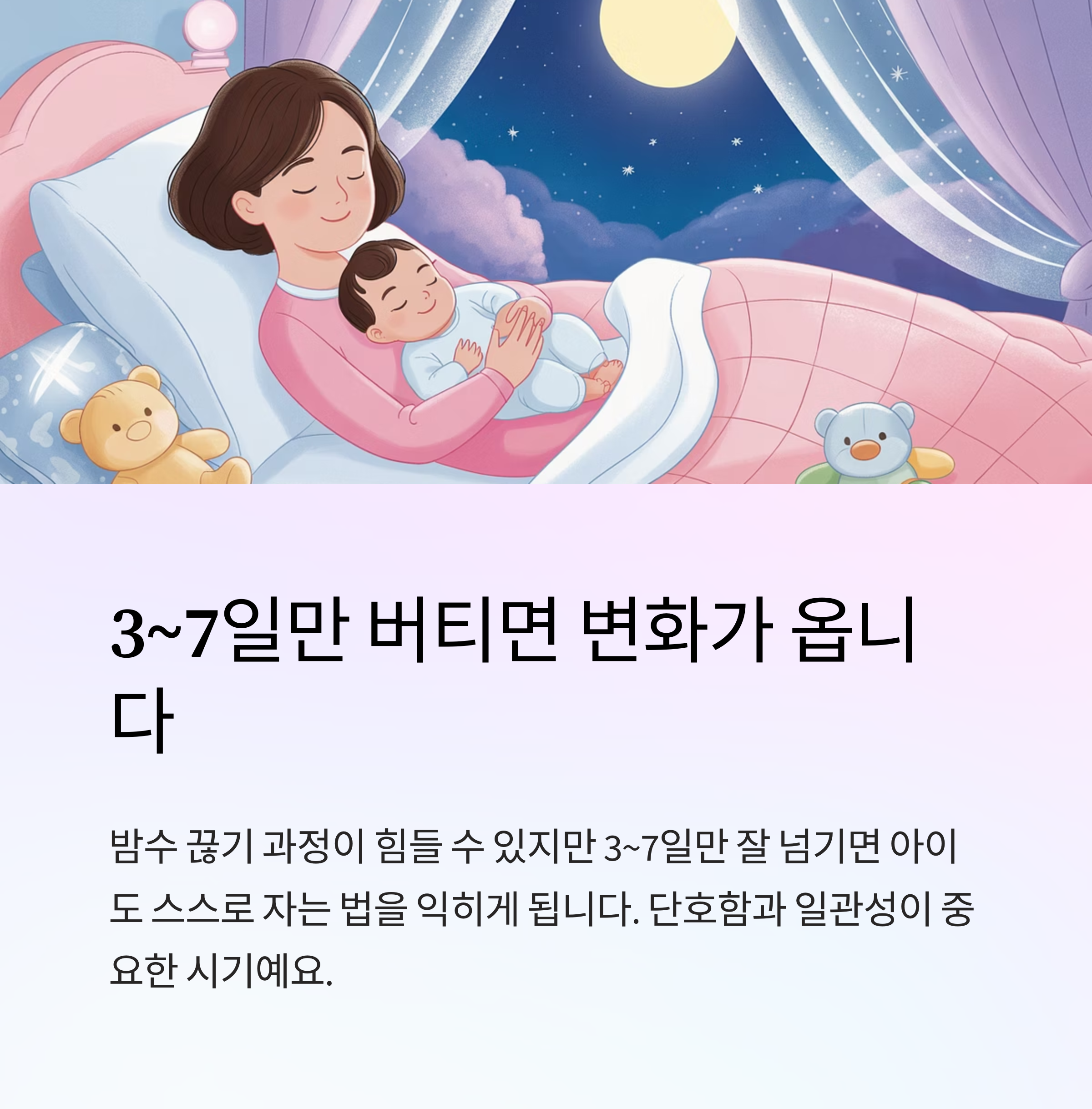 - "밤수 끊고 나니, 아이 수면 퀄리티가 달라졌어요. 단호함도 필요해요!"