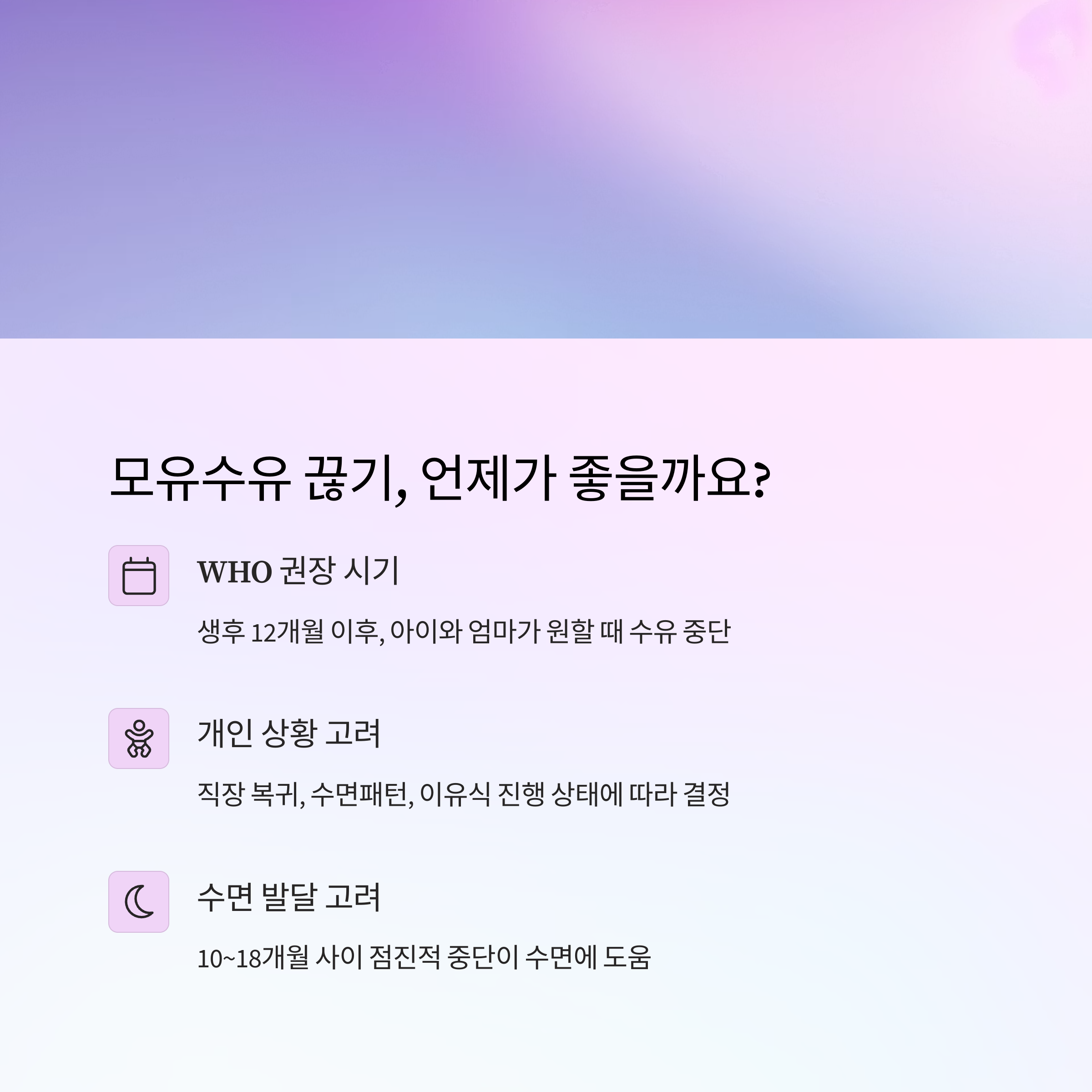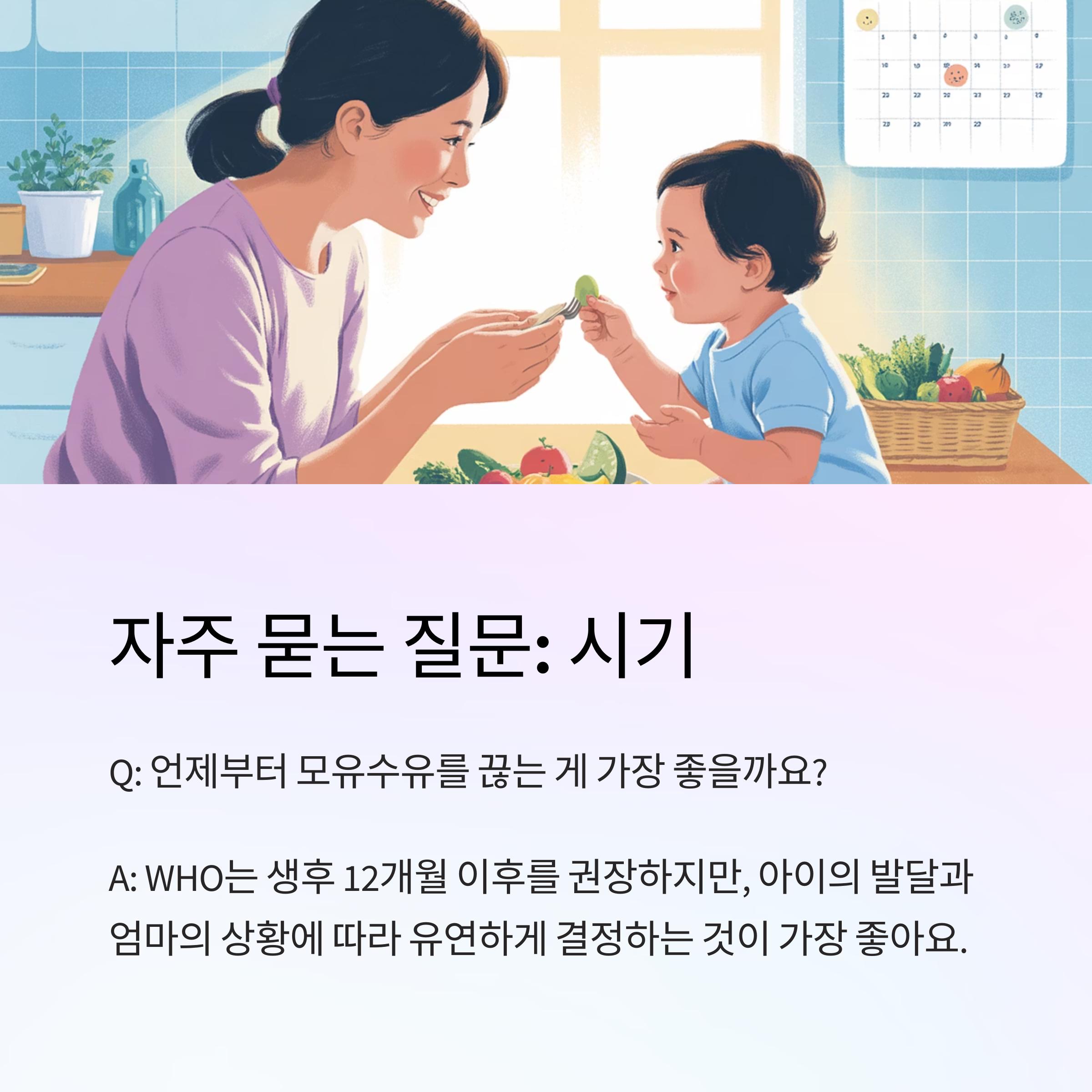 WHO는 생후 12개월 이후를 권장하지만, 아이의 발달과 엄마의 상황에 따라 유연하게 결정하는 것이 가장 좋아요.