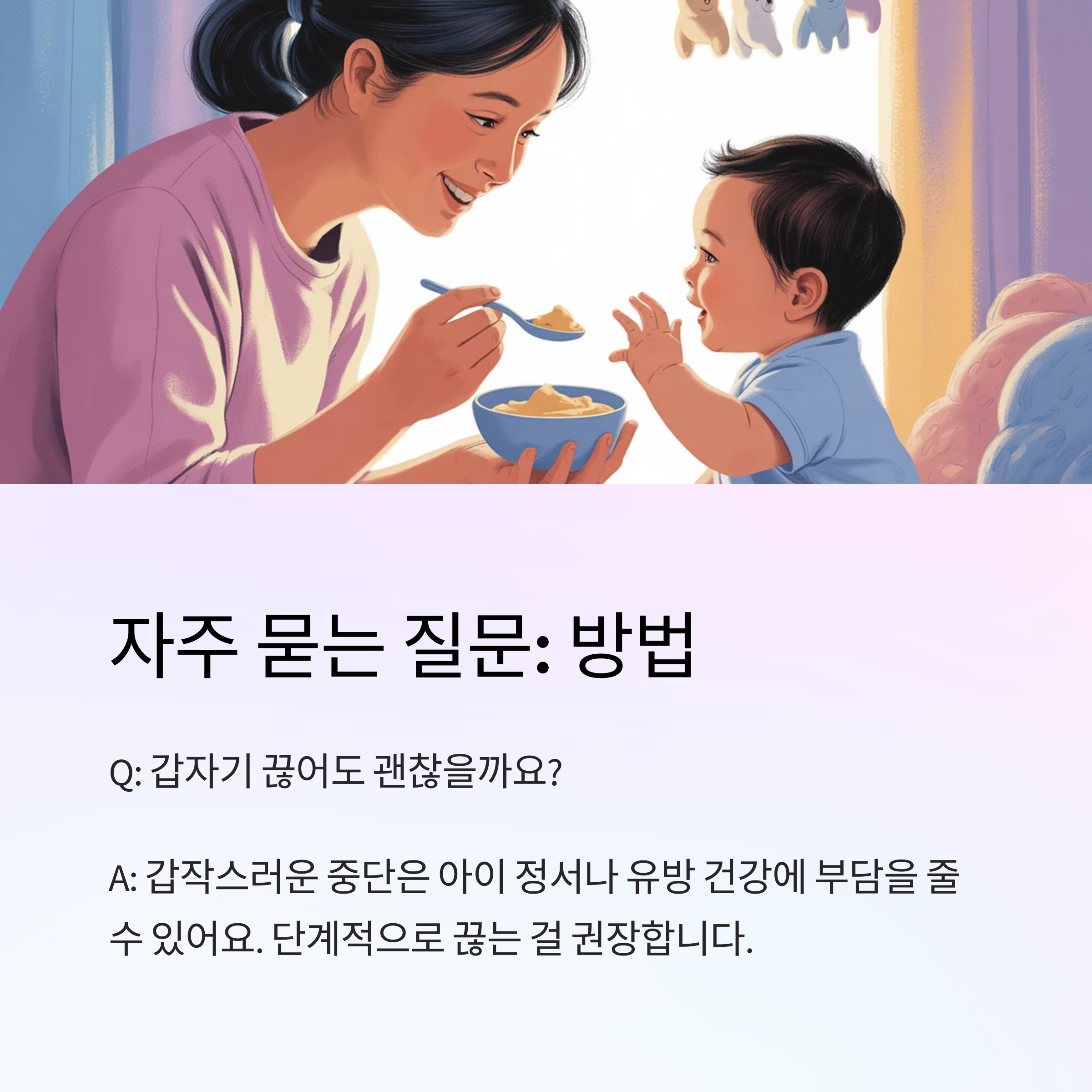 갑작스러운 중단은 아이 정서나 유방 건강에 부담을 줄 수 있어요. 단계적으로 끊는 걸 권장합니다.