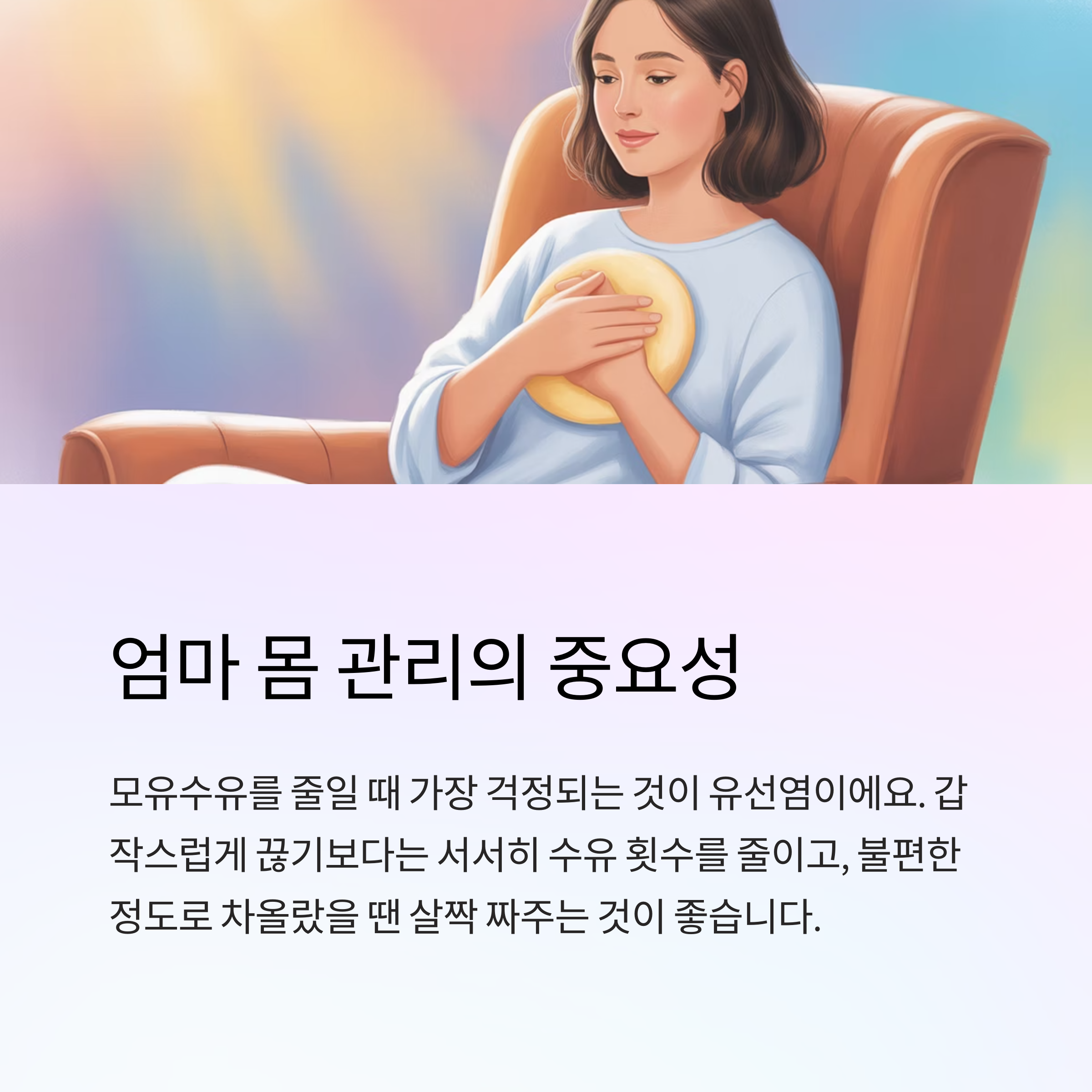 모유수유를 줄일 때 가장 걱정되는 것 중 하나가 바로 유선염이에요. 갑작스럽게 끊기보다는 서서히 수유 횟수를 줄이고, 불편한 정도로 차올랐을 땐 살짝 짜주는 것이 좋아요. 특히 유방 마사지나 온찜질을 병행하면 통증도 줄고 멍울도 예방할 수 있답니다.
