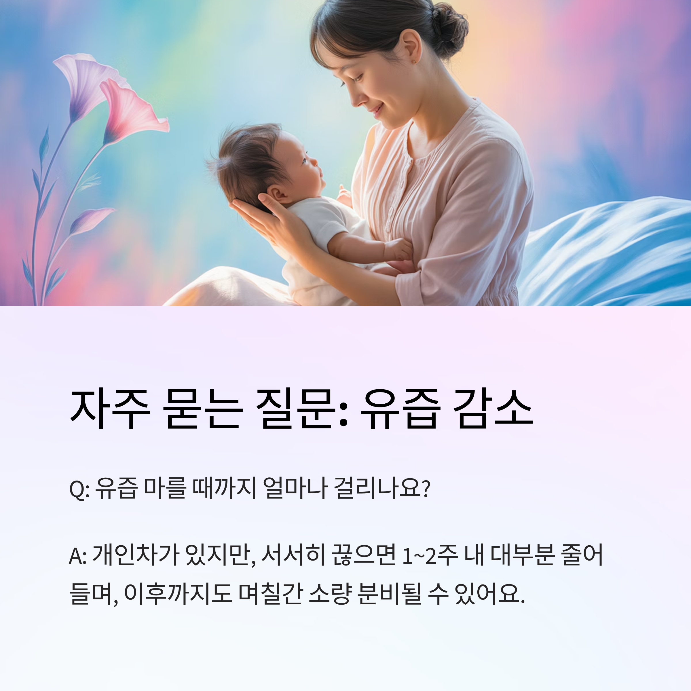 개인차가 있지만, 서서히 끊으면 1~2주 내 대부분 줄어들며, 이후까지도 며칠간 소량 분비될 수 있어요.