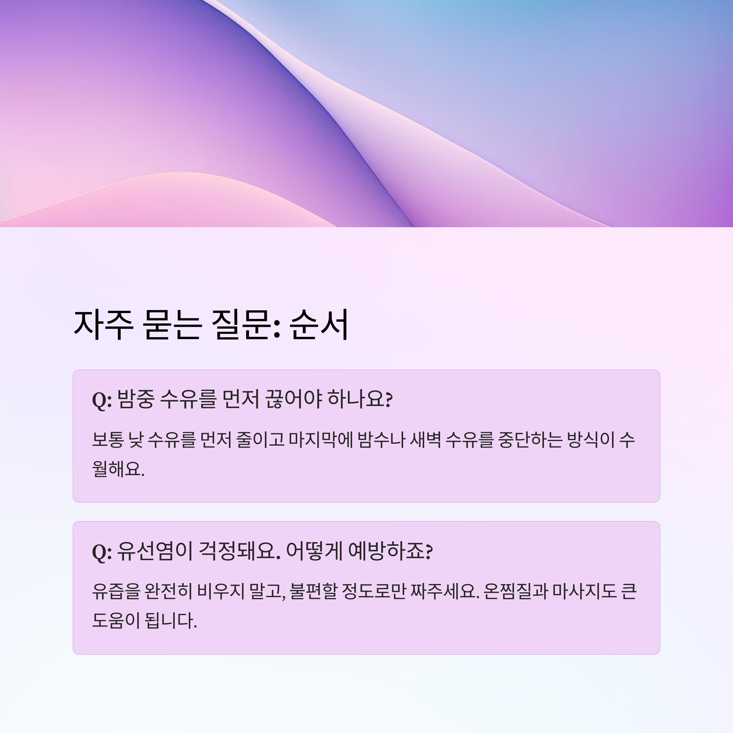 갑작스러운 중단은 아이 정서나 유방 건강에 부담을 줄 수 있어요. 단계적으로 끊는 걸 권장합니다.