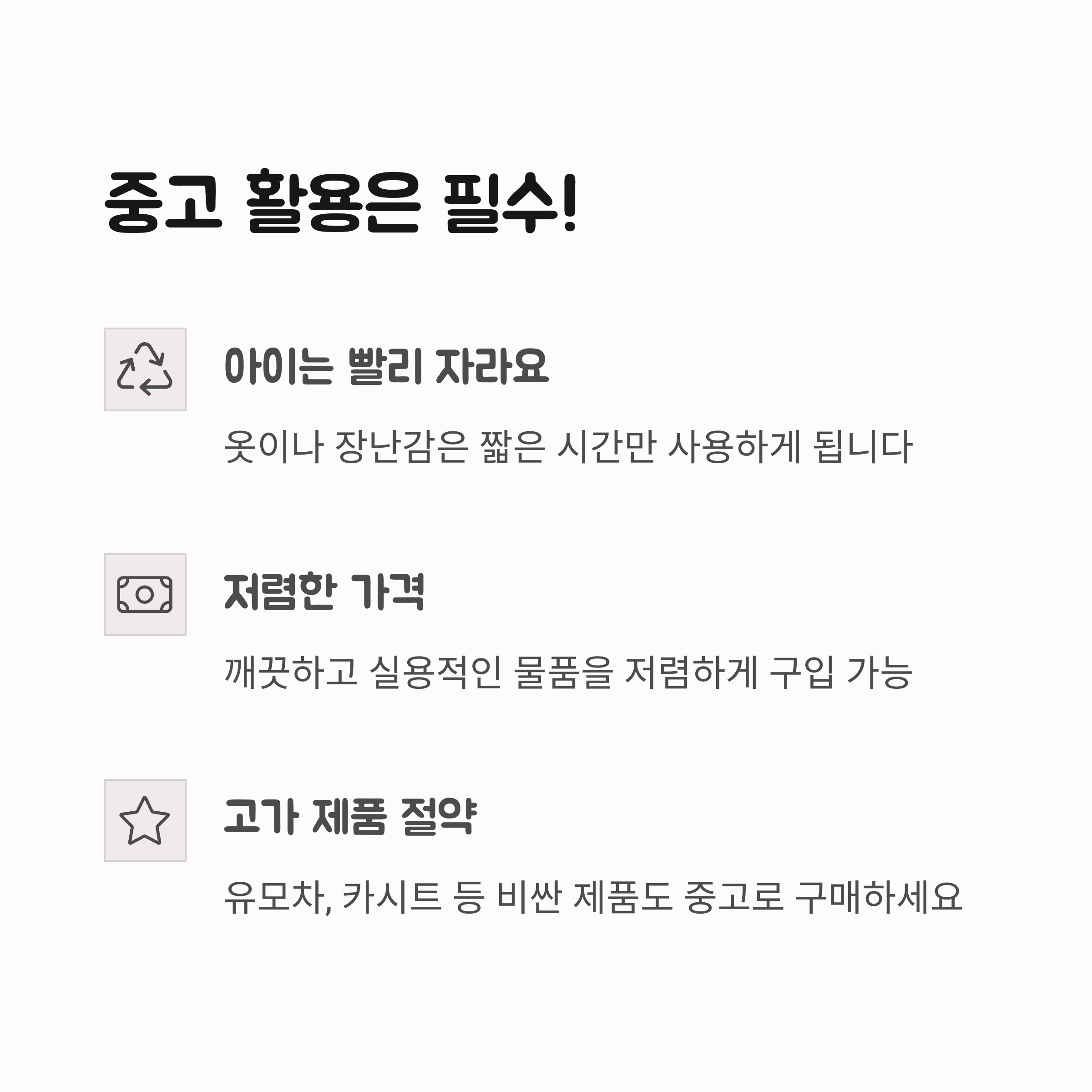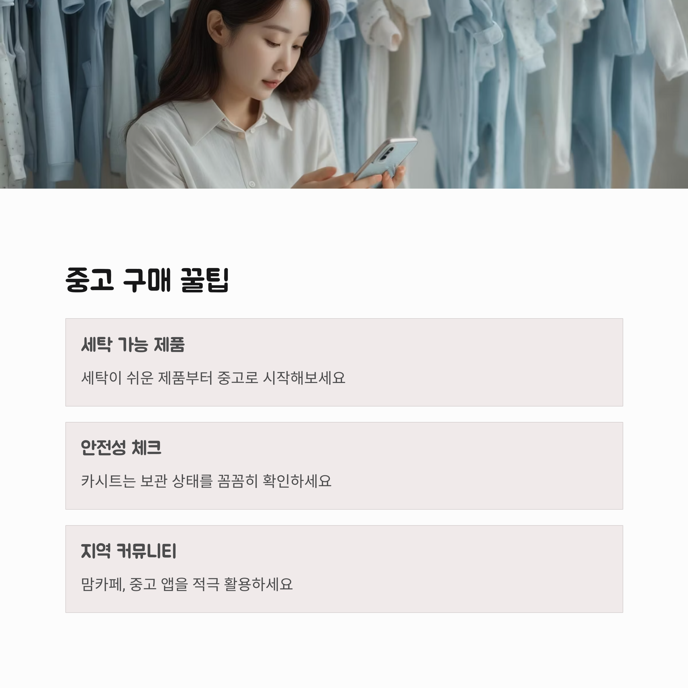 세탁 가능한 제품, 사용 기간이 짧은 용품부터 중고로 시작해보세요.