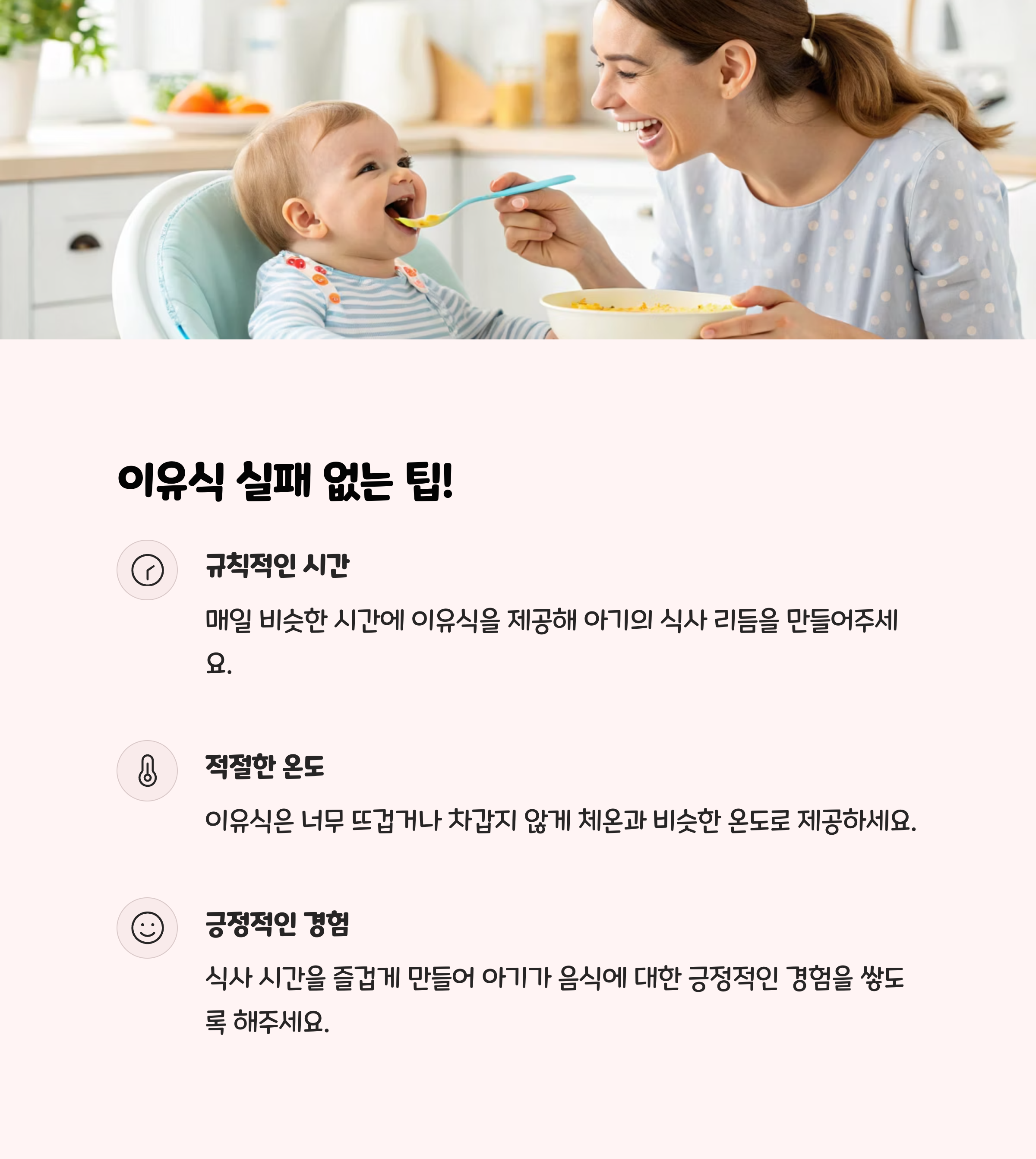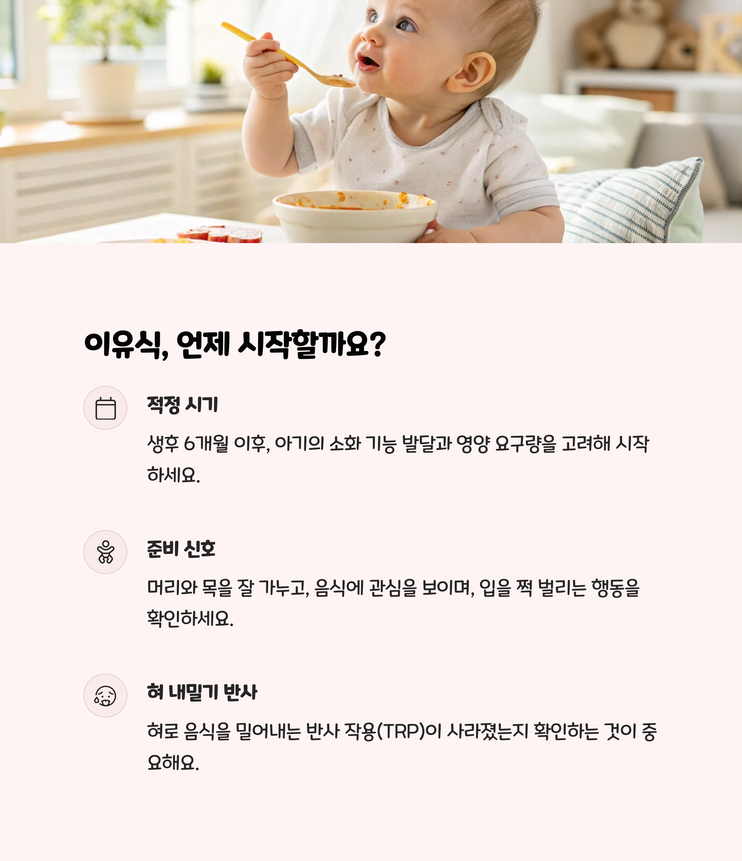 이유식은 생후 6개월 이후 시작하는 것이 좋아요. 아기의 준비 신호를 잘 관찰하는 것이 중요하답니다.