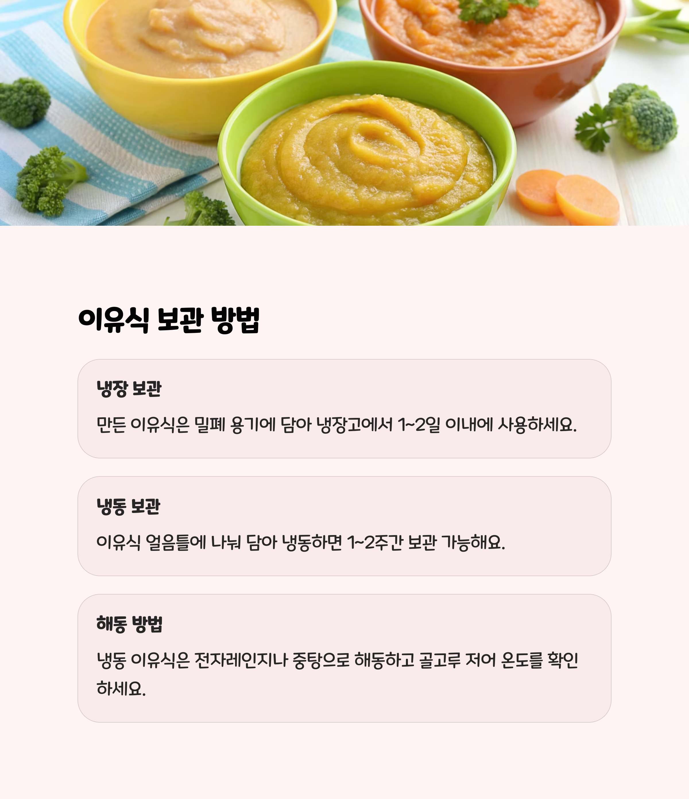 소독 철저 + 신선한 재료 사용 = 건강한 이유식