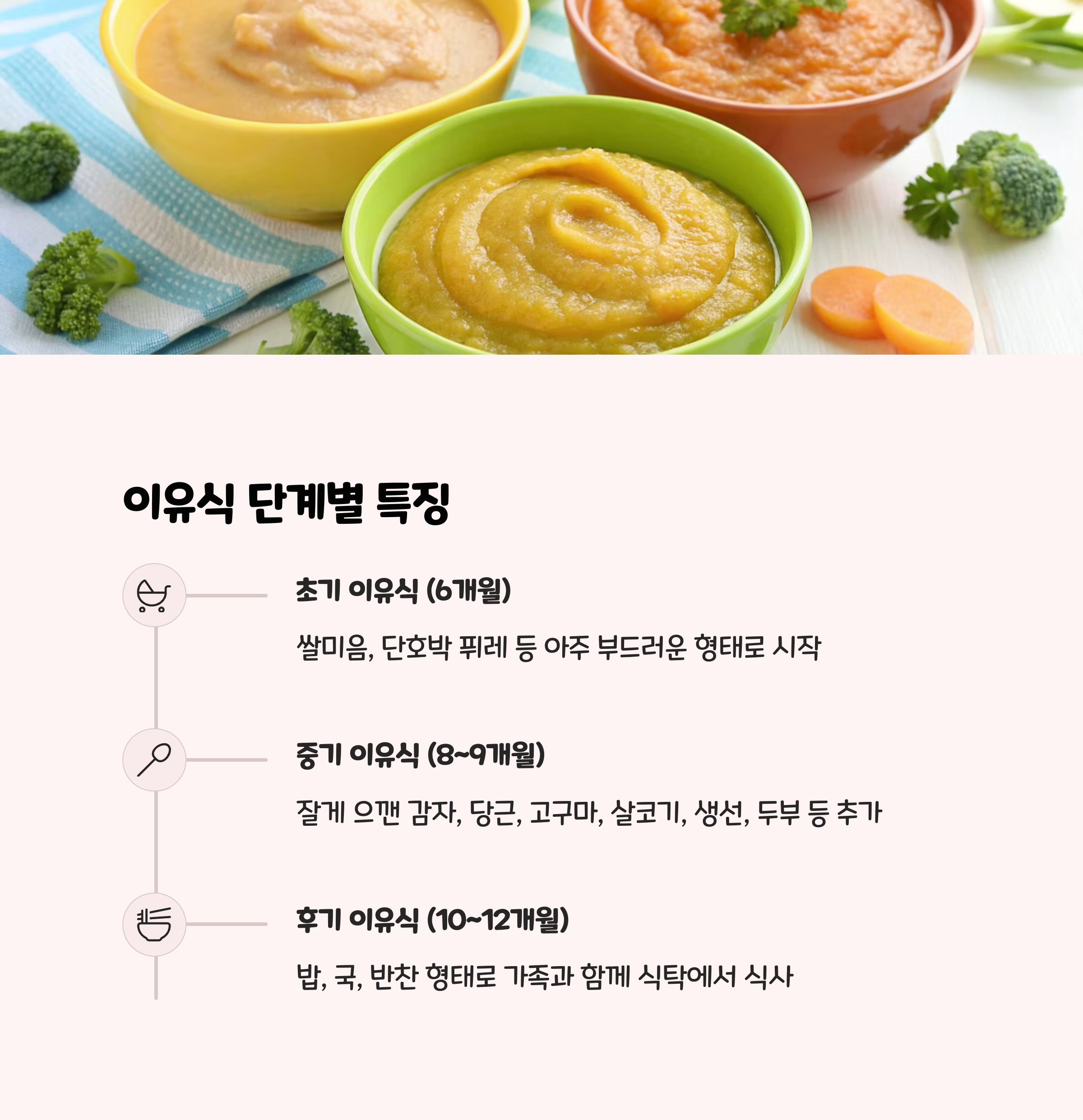이유식은 초기(6개월), 중기(8~9개월), 후기(10~12개월)로 나뉘어요.