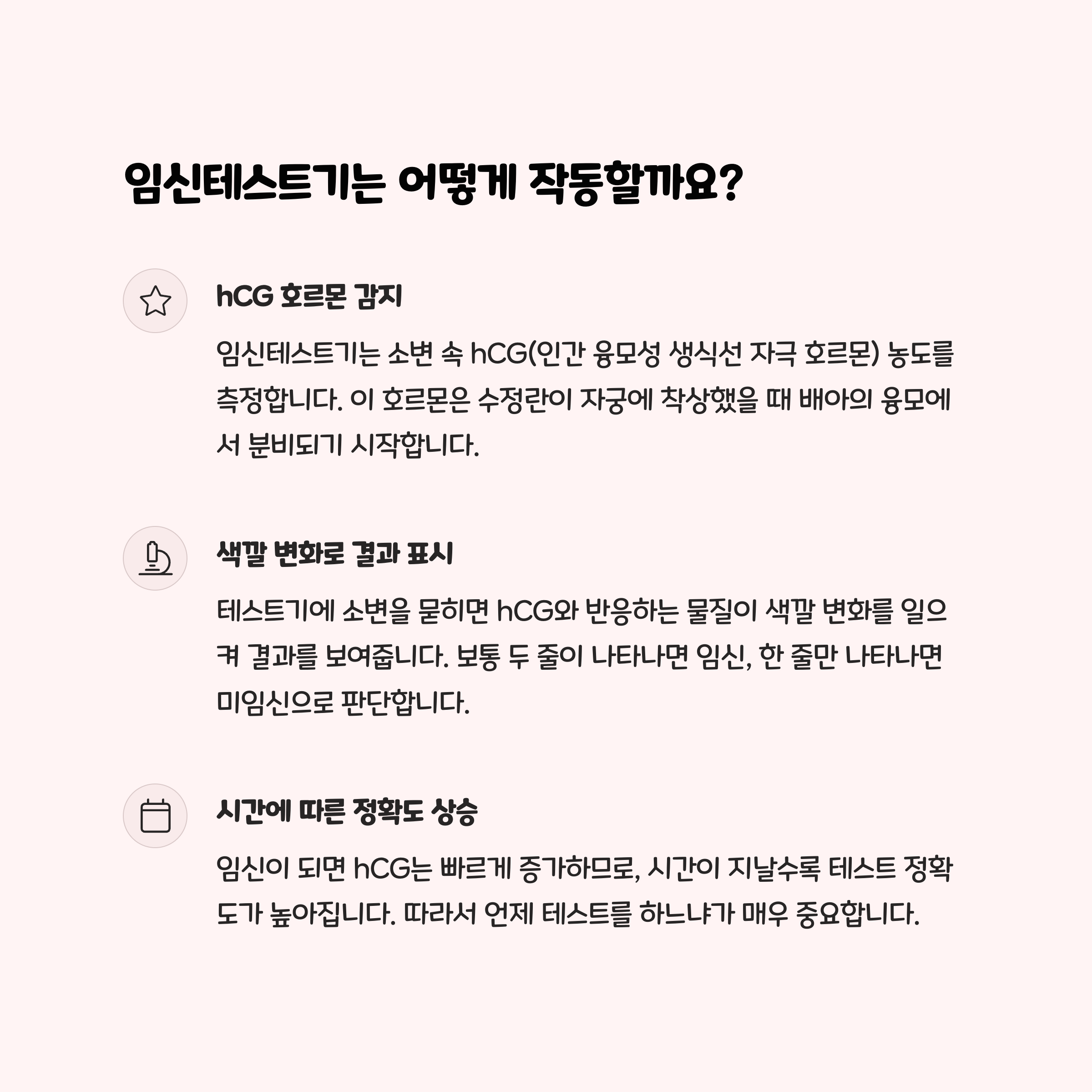 임신테스트기는 hCG 호르몬을 감지하여 임신 여부를 알려주는 방식이에요.
