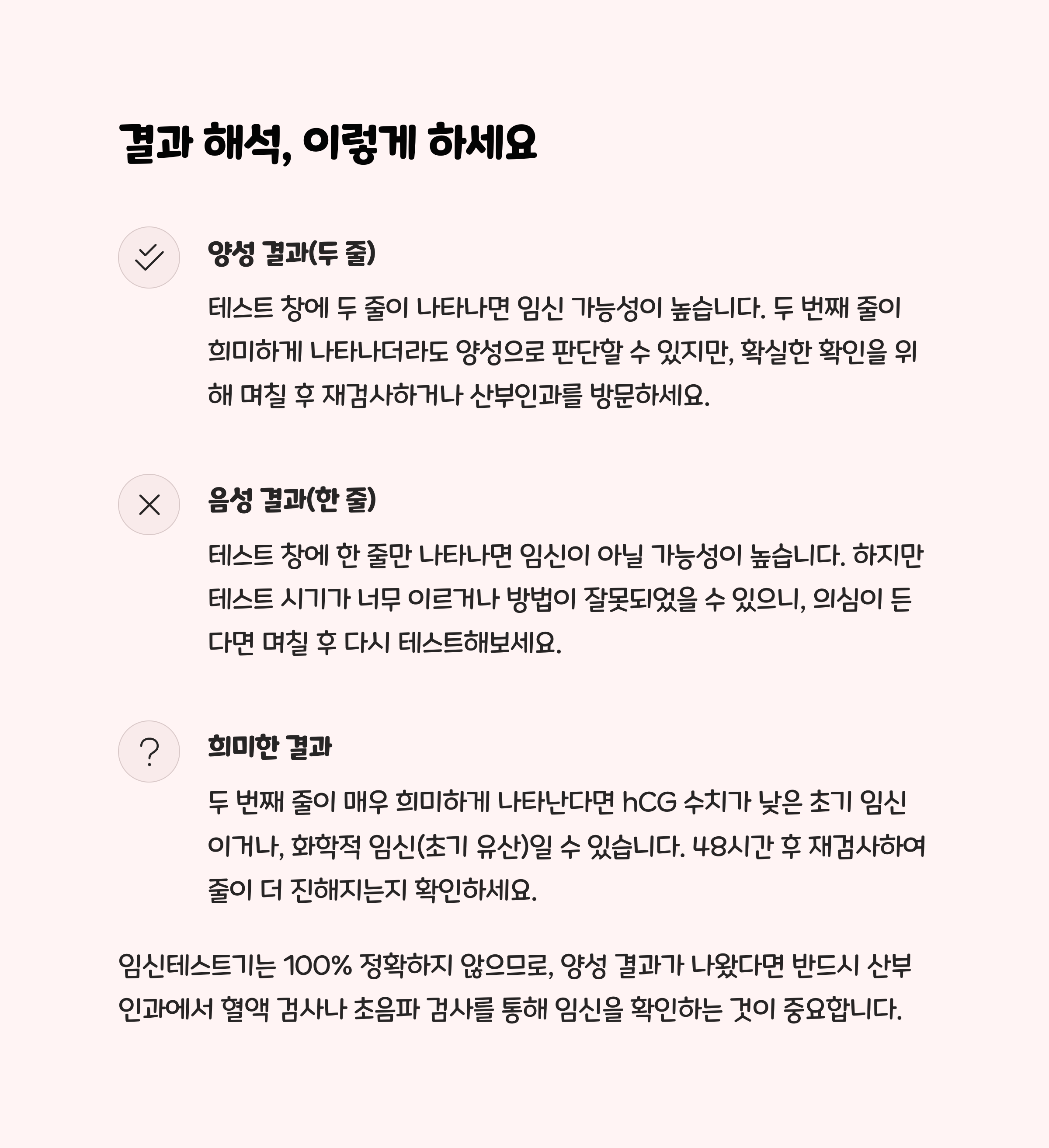 생리 예정일 기준으로 타이밍을 잡아야 hCG 농도가 높아 정확도가 올라가요.