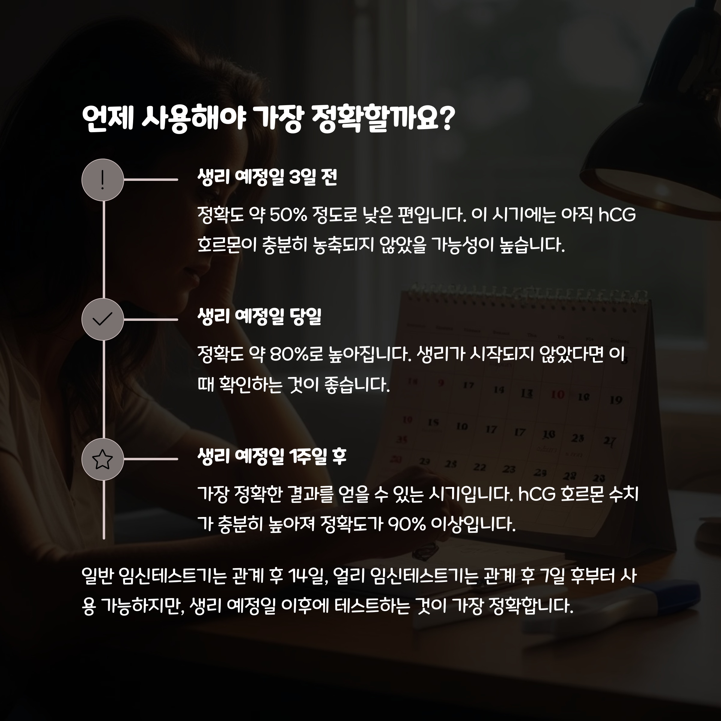 예정일 전엔 50%, 예정일 즈음엔 80%, 생리 지연 후는 가장 정확해요.