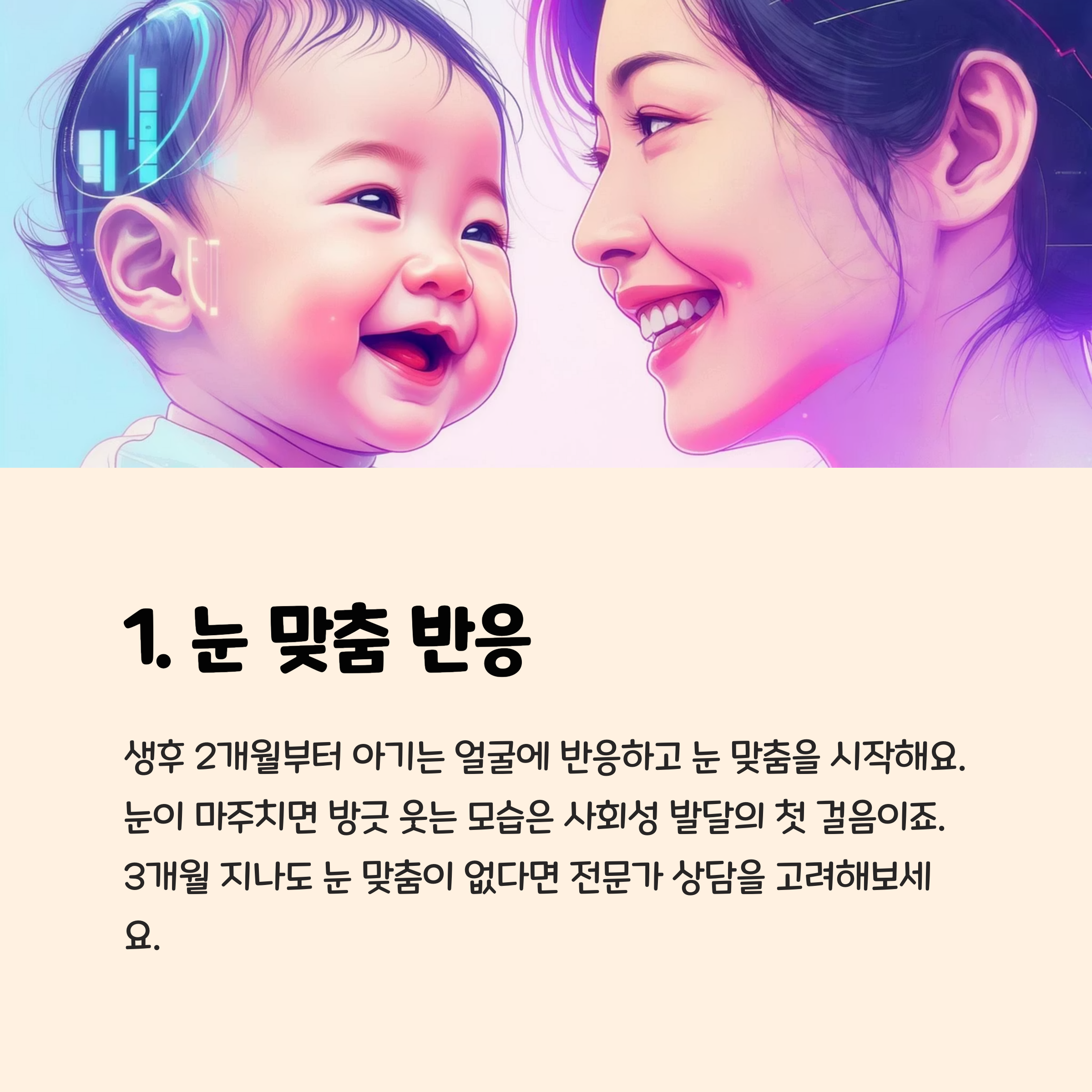 생후 3개월이 지나도록 눈맞춤이 거의 없거나 반응이 무덤덤하다면 발달 지연 여부를 점검해보는 것이 좋아요.