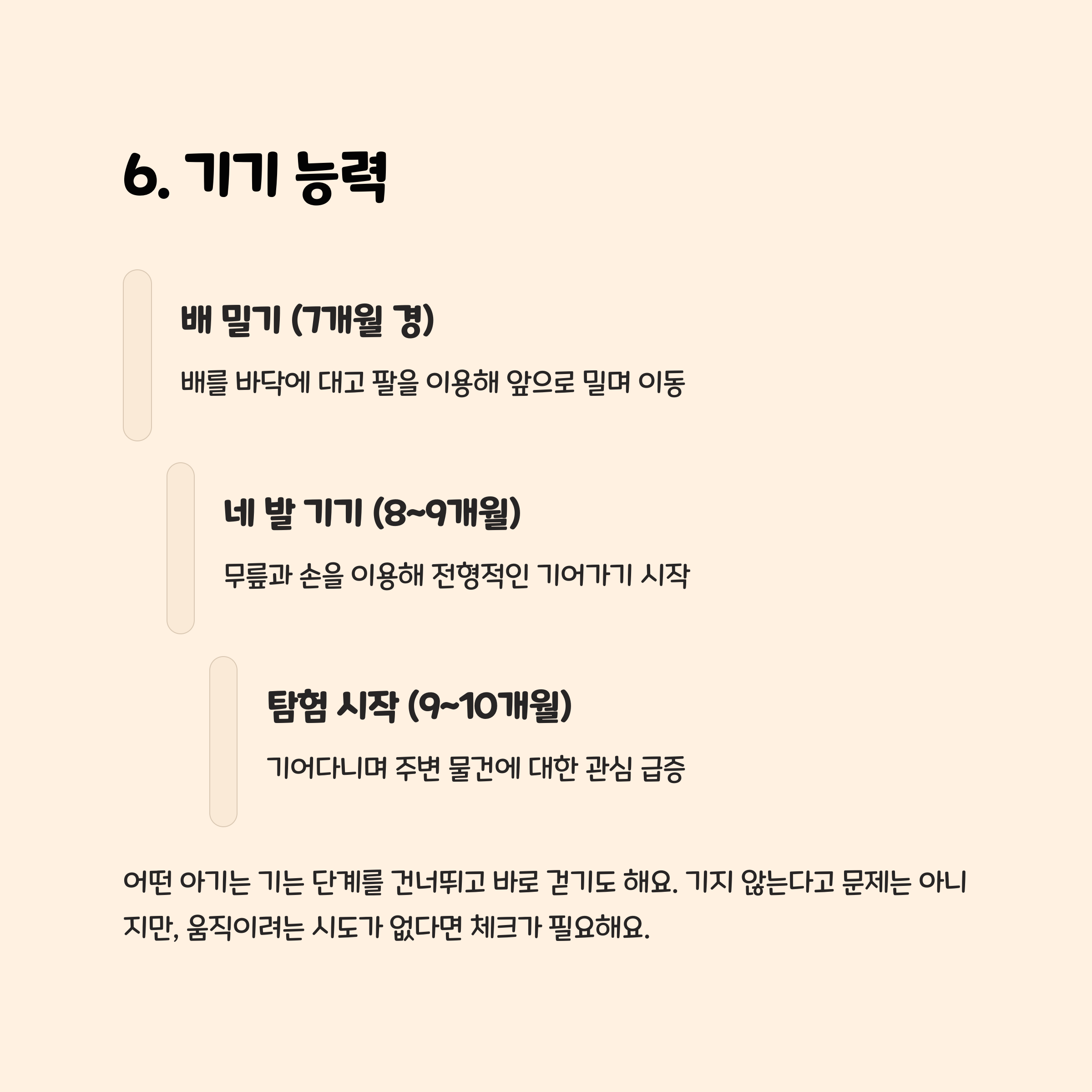 이 시기부터 아기의 탐험 본능이 본격적으로 발동합니다. 7~10개월경엔 무릎과 손을 이용해 네 발로 기거나, 배를 끌면서 전진하기도 해요. 어떤 아기는 기는 시기를 건너뛰고 바로 걷기도 해요. 그래서 기지 않는다고 해서 꼭 문제는 아니지만, 너무 오랫동안 움직이려는 시도조차 없다면 체크가 필요합니다.