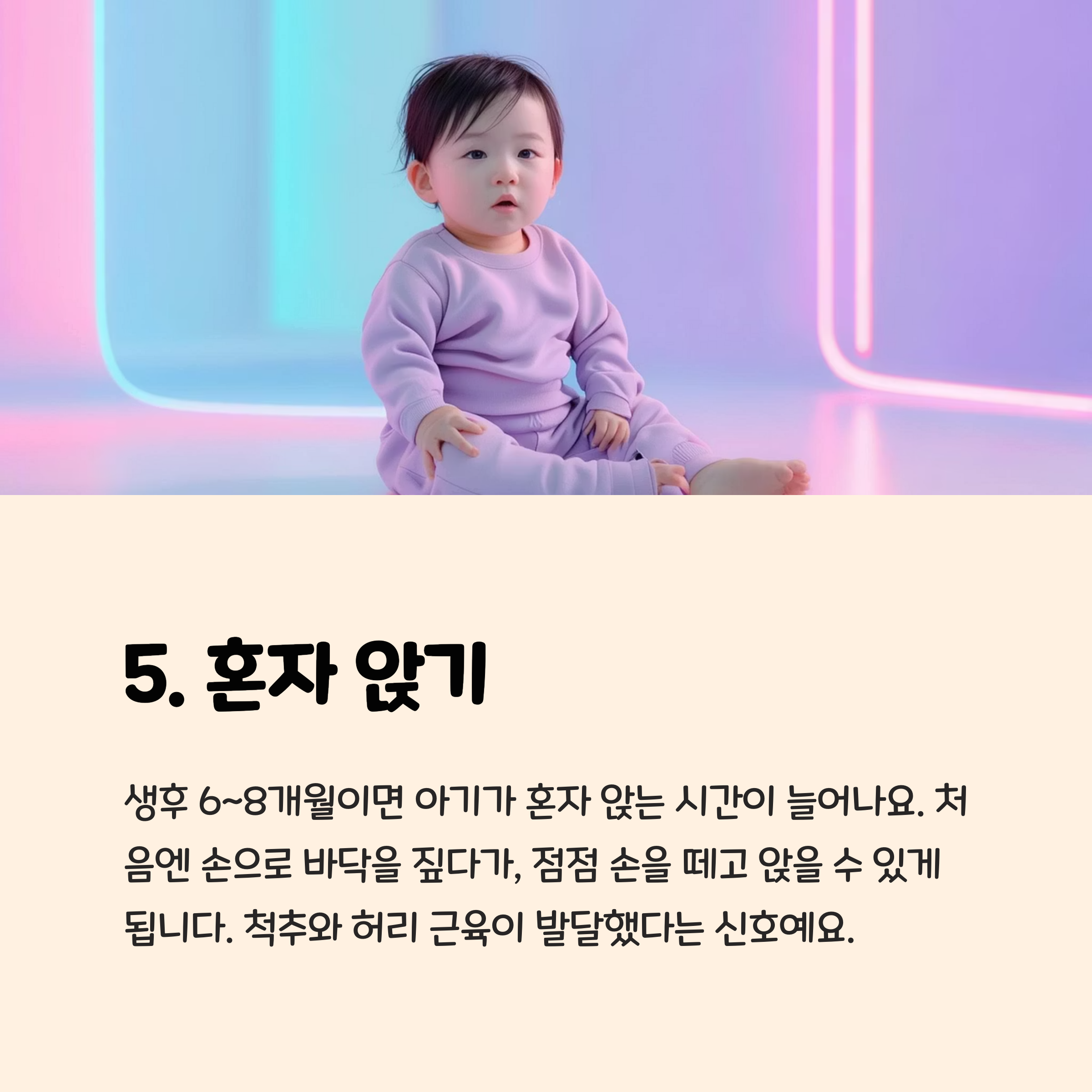 생후 6~8개월쯤이면 아기가 혼자 앉아 있는 시간이 늘어나요. 척추와 허리 근육이 어느 정도 안정되었다는 신호죠. 처음엔 손으로 바닥을 짚고 앉다가, 점점 손을 떼고 앉을 수 있어요. 등받이 없는 의자에 잠깐 앉혀보는 연습도 괜찮습니다.