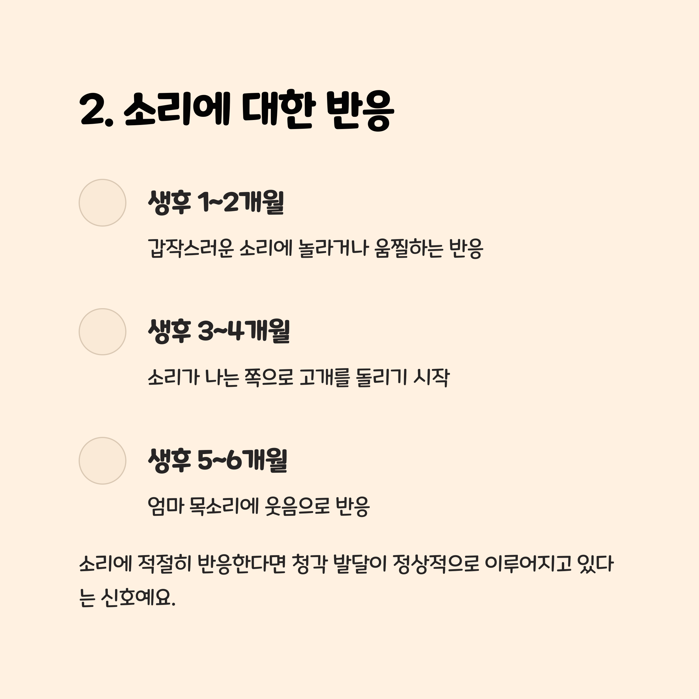 | 소리 쪽으로 고개 돌리기 | 생후 3~4개월 |