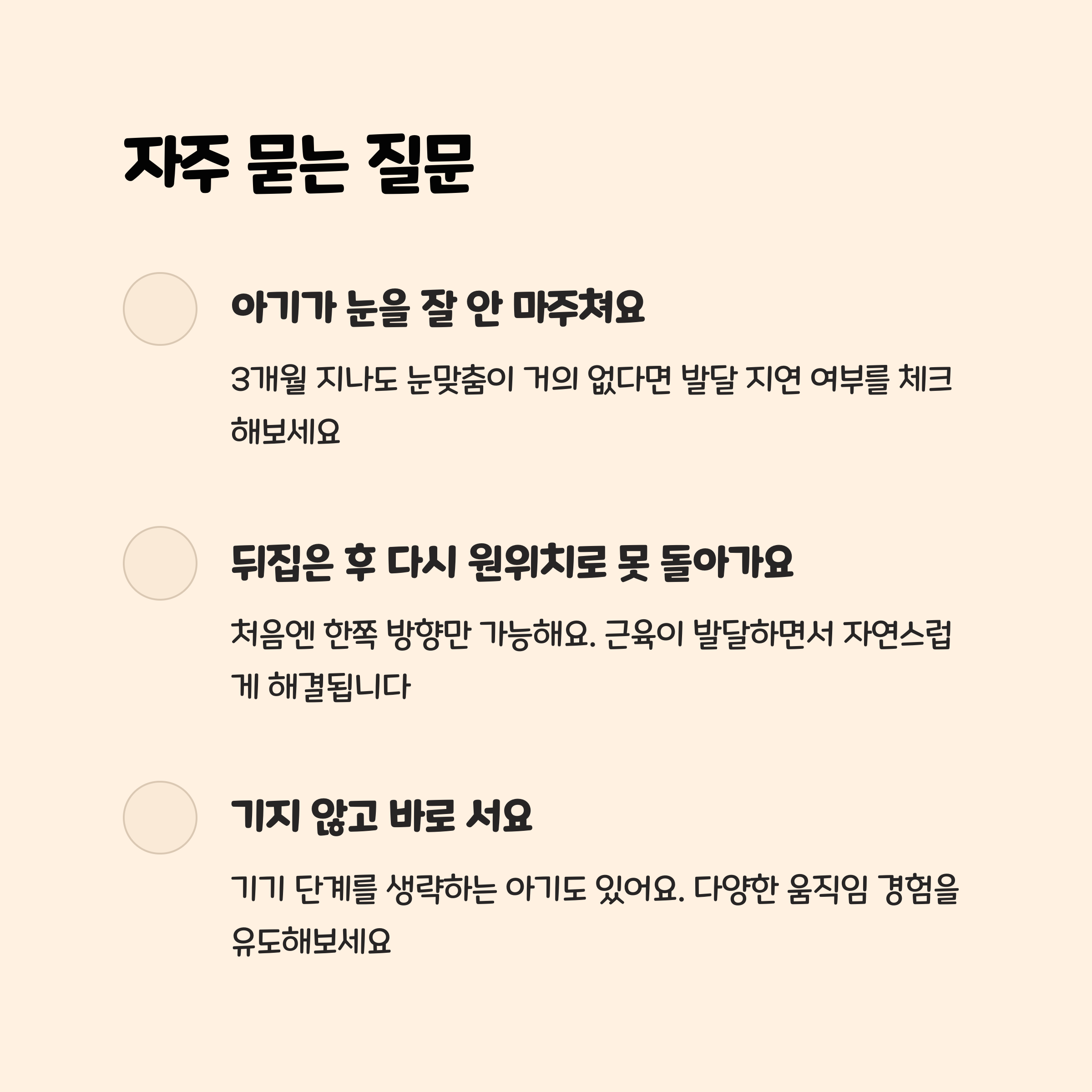 처음엔 한쪽 방향으로만 움직이는 경우가 많아요. 점차 근육이 발달하면서 다시 뒤집는 방법도 스스로 터득하게 됩니다.