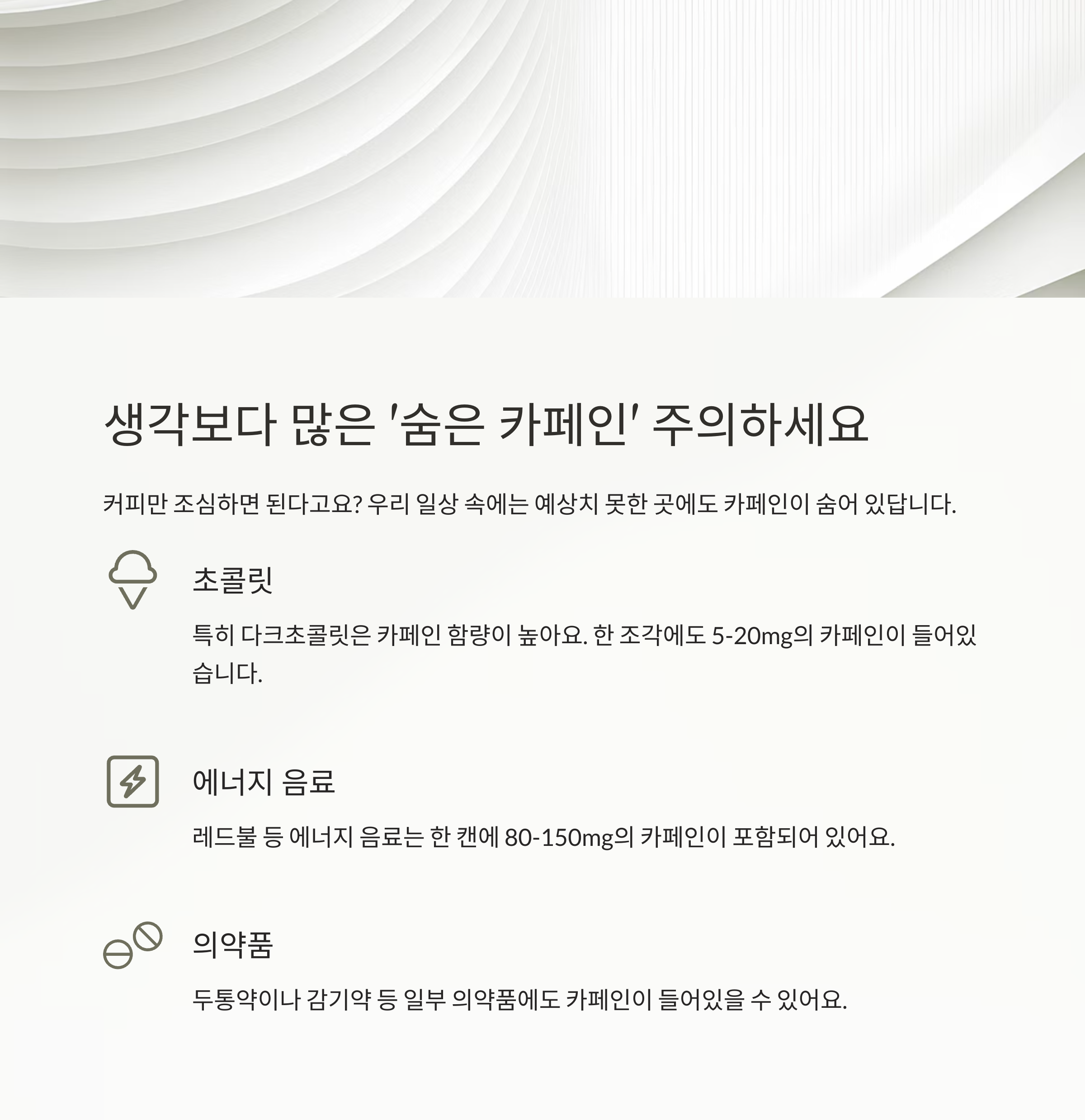 커피만 조심하면 된다고요? 천만에요. 우리 일상 속에는 예상치 못한 곳에도 카페인이 숨어있어요. 그래서 아래 리스트를 꼭 확인해 보세요!