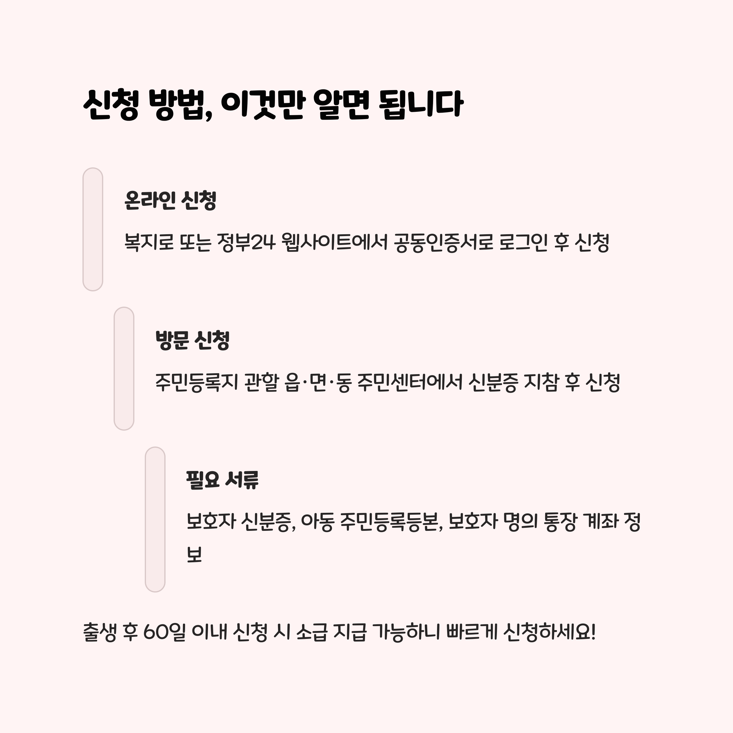 출생 후 60일 이내 신청 시 소급 지급 가능하니, 빠르게 신청하는 게 이득이에요. 출생신고가 지연되는 경우에도, 소송 중이거나 국적 취득 절차 중이라면 소급 기준 예외 적용도 가능하답니다.