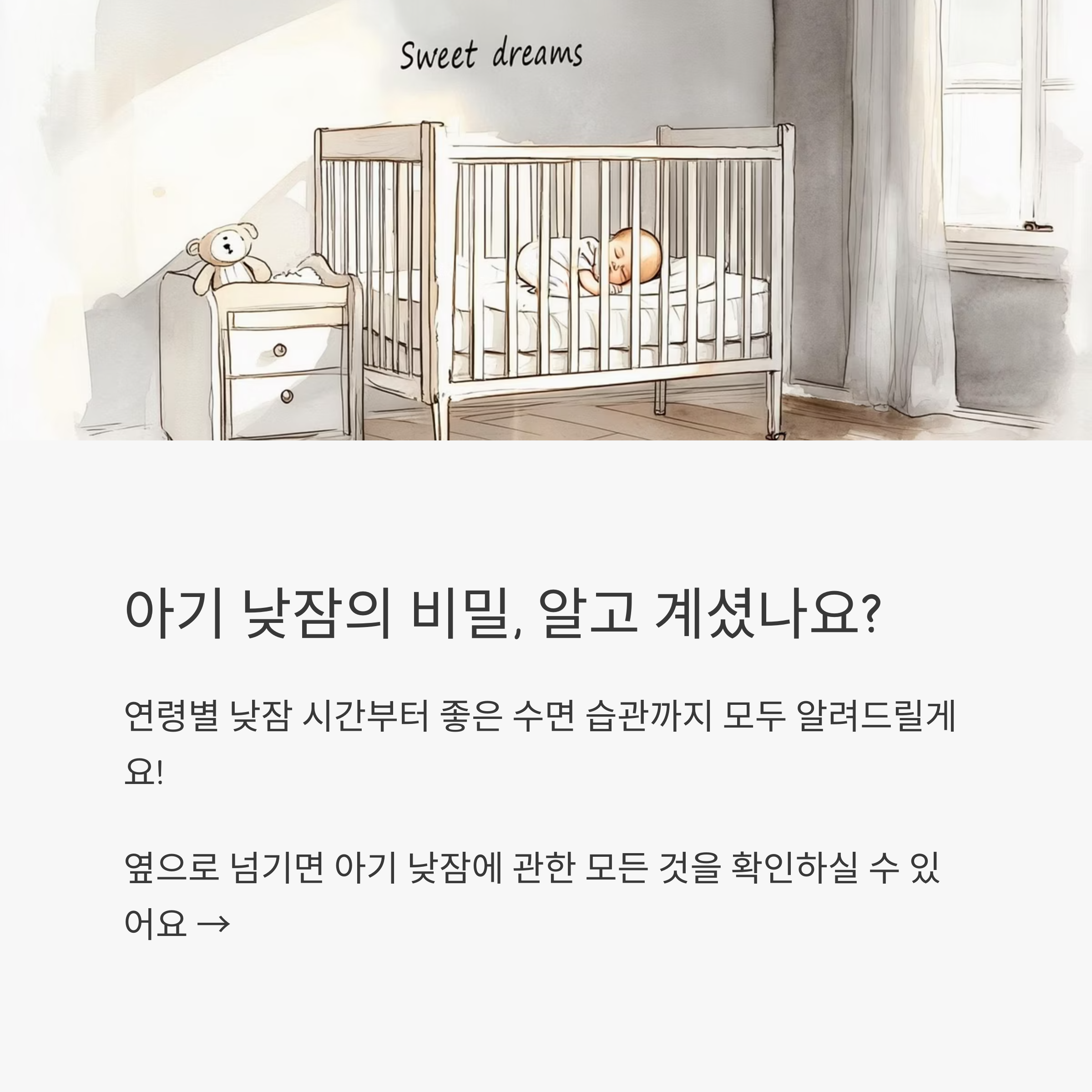 아기 낮잠시간, 하루에 얼마나 자야 할까?우리 아기, 오늘도 낮잠 잘 자고 있나요? 연령대별 낮잠 시간부터 좋은 수면 습관까지 모두 알려드릴게요!목차1. 왜 낮잠이 필요할까요?2. 연령별 낮잠 권장 시간3. 아기 낮잠 패턴의 변화4. 낮잠이 부족할 때의 신호5. 좋은 낮잠 습관 만들기6. 낮잠 관련 자주 하는 실수왜 낮잠이 필요할까요?아기의 낮잠은 단순한 쉼이 아닙니다. 뇌 발달과 신체 성장은 물론, 감정 조절 능력까지 낮잠 시간 동안 강화됩니다. 하루 중 한두 차례의 낮잠은 아기에게 깊은 휴식과 에너지를 제공해주며, 밤잠의 질을 높이는 데에도 큰 역할을 합니다.중요 포인트낮잠은 밤잠과 함께 아기의 건강한 수면 리듬을 만들어줍니다.연령별 낮잠 권장 시간연령하루 낮잠 시간횟수0~3개월4~5시간3~5회4~6..