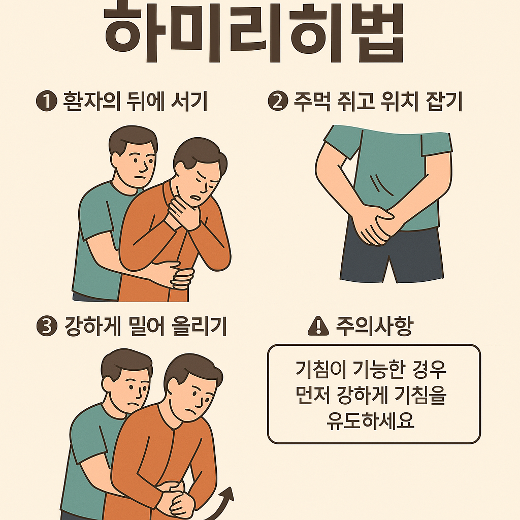 🚑 하임리히법 완벽 가이드하임리히법(Heimlich maneuver)이란 음식물이나 이물질이 목에 걸려 질식 위험이 있을 때 실시하는 응급처치법입니다. 특히 음식을 먹다가 갑자기 기도가 막혔을 때 빠르게 처치하면 생명을 구할 수 있습니다.📌 하임리히법이 필요한 상황갑자기 숨을 쉬지 못하고 기침이 나오지 않음말을 못하고 손으로 목을 잡고 괴로워함얼굴이 파랗게 변하거나 의식을 잃을 듯한 모습주의: 기침이 가능한 경우는 먼저 강하게 기침을 유도하세요.📌 하임리히법 실시 방법 (성인 기준)1️⃣ 환자의 뒤에 서기환자의 등 뒤로 가서 다리를 어깨너비로 벌려 안정적인 자세를 유지합니다.2️⃣ 주먹 쥐고 위치 잡기한 손을 주먹을 쥐고, 엄지손가락 쪽을 환자의 명치(배꼽 위쪽 갈비뼈 아래 중간)에 댑니다. 다른 ..